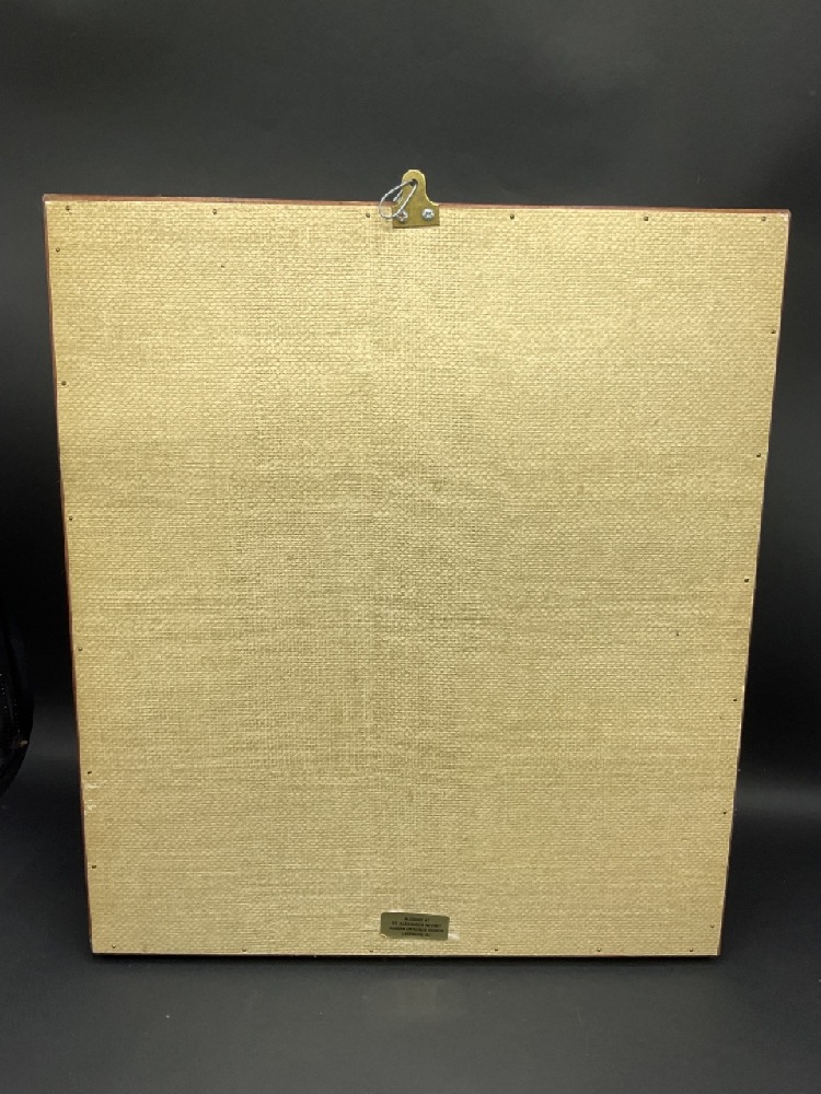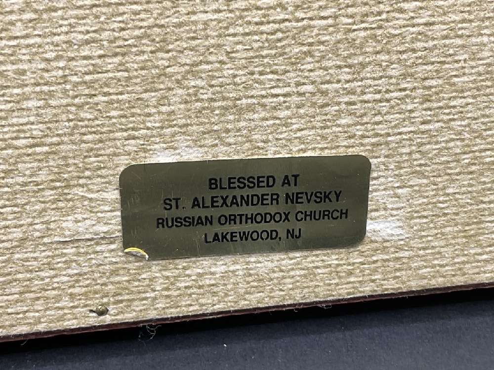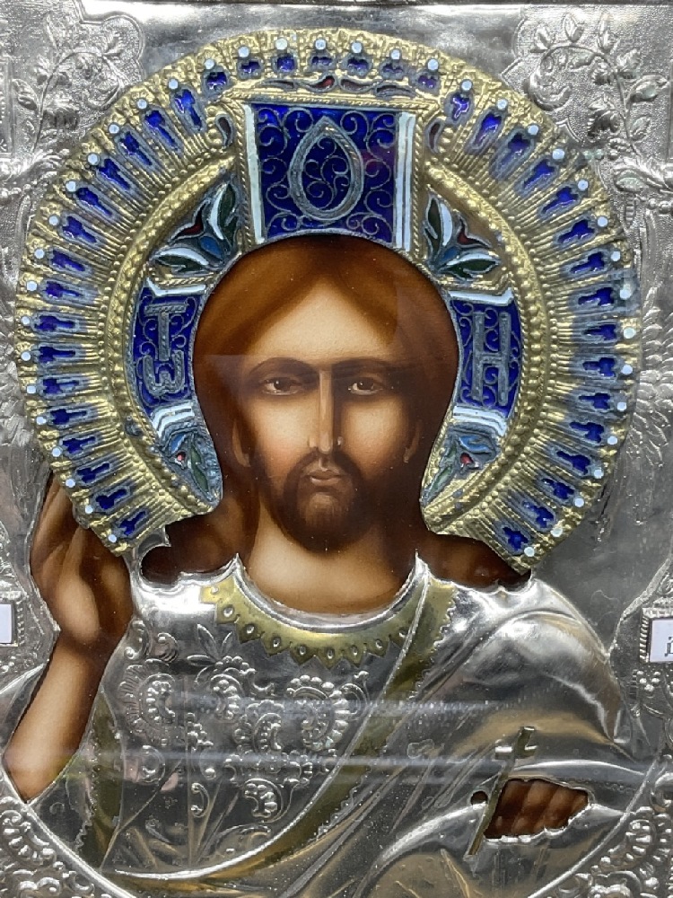 Russian enameled icon housed in shadow box frame.