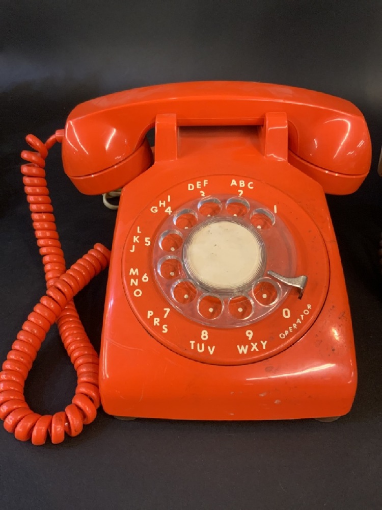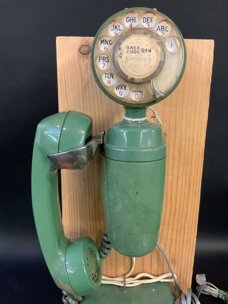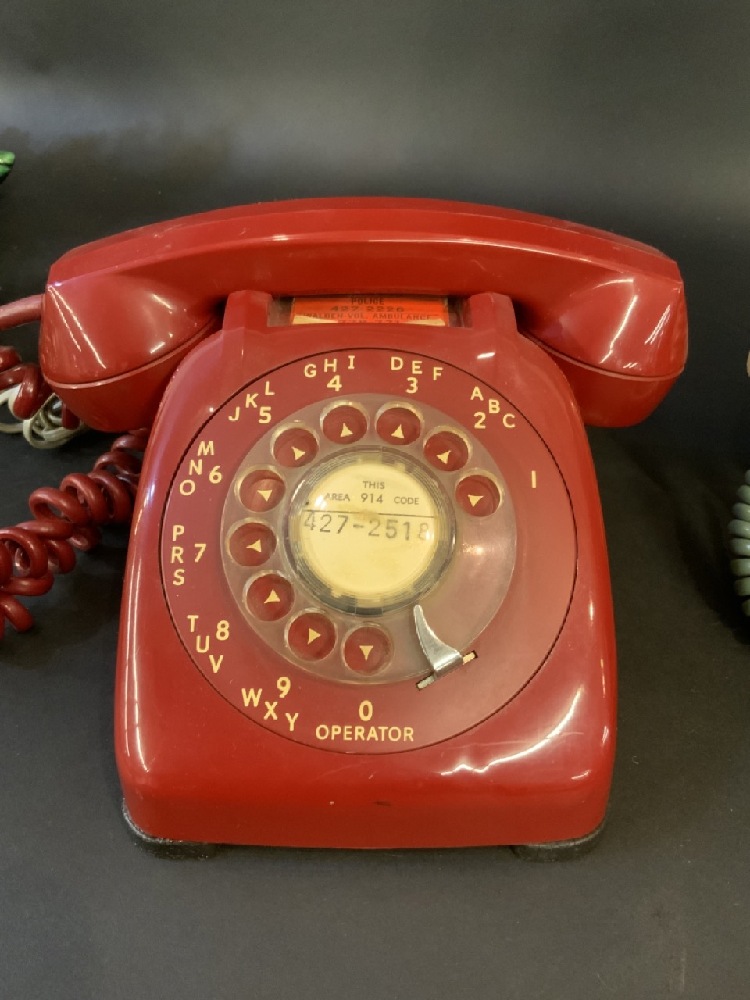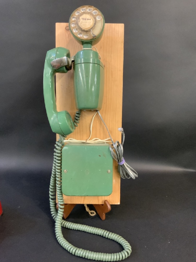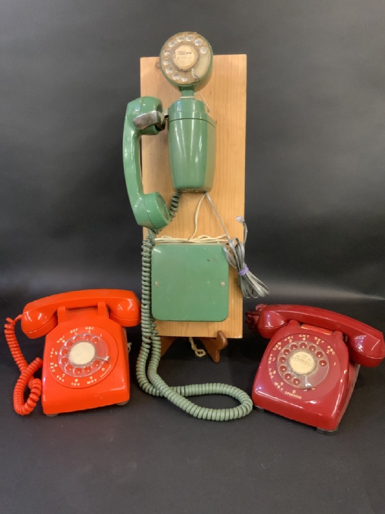 Three (3) Vintage Telephones. Green wall model and two red "Emergency" telephones.