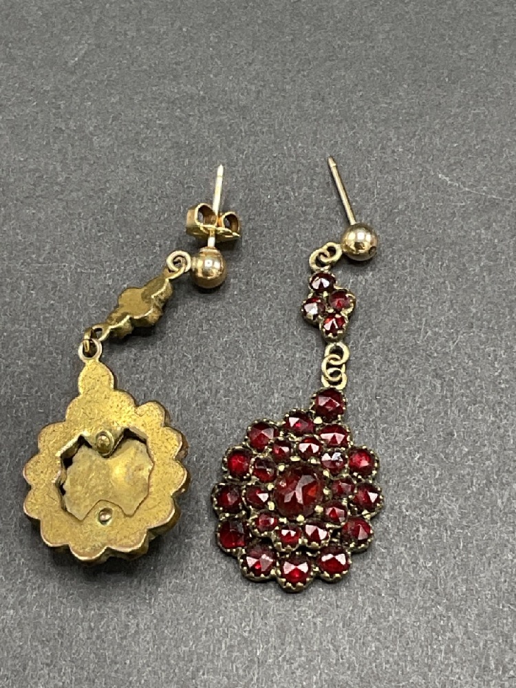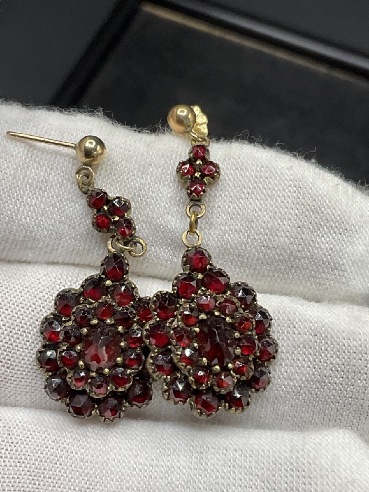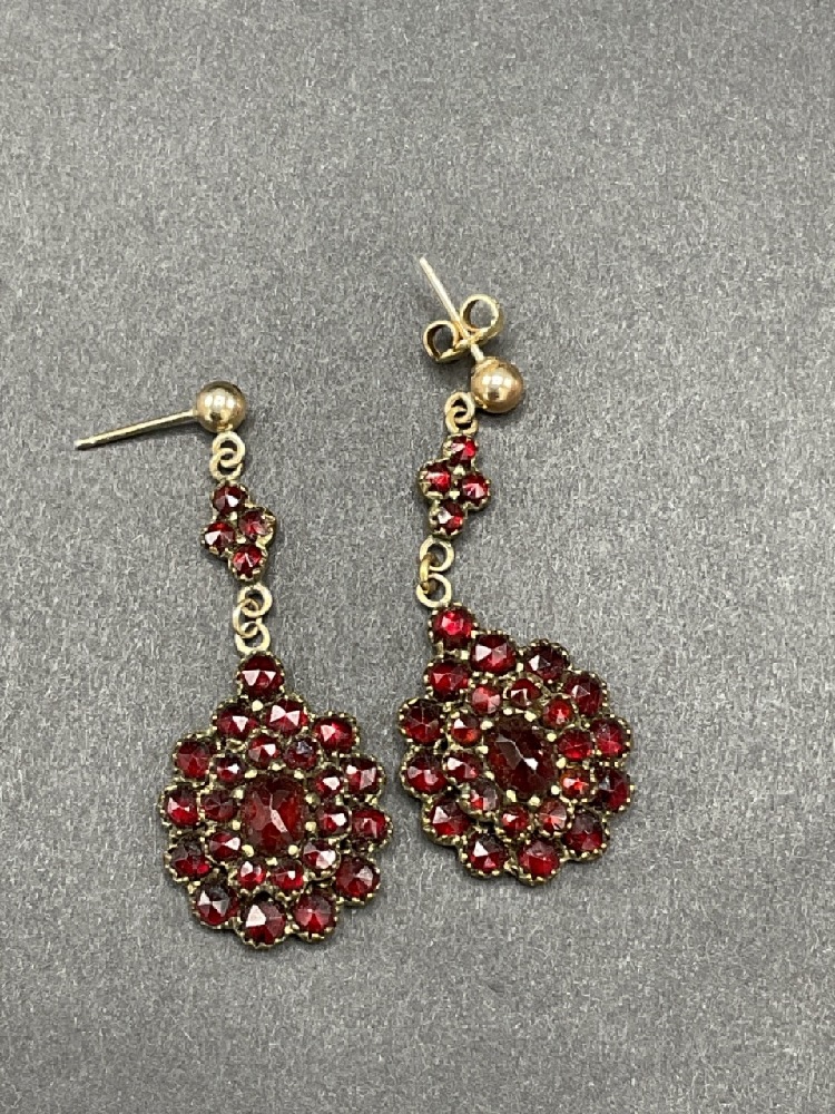 A pair of Bohemian garnet pierced drop earrings.