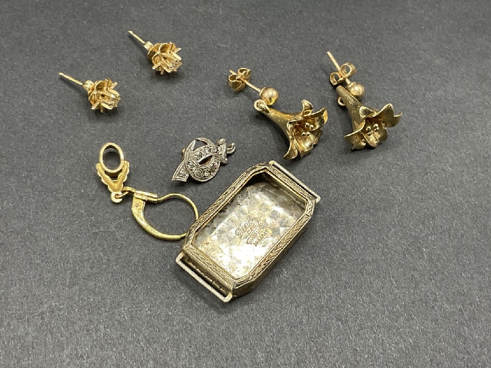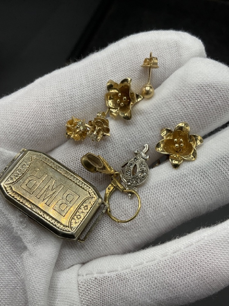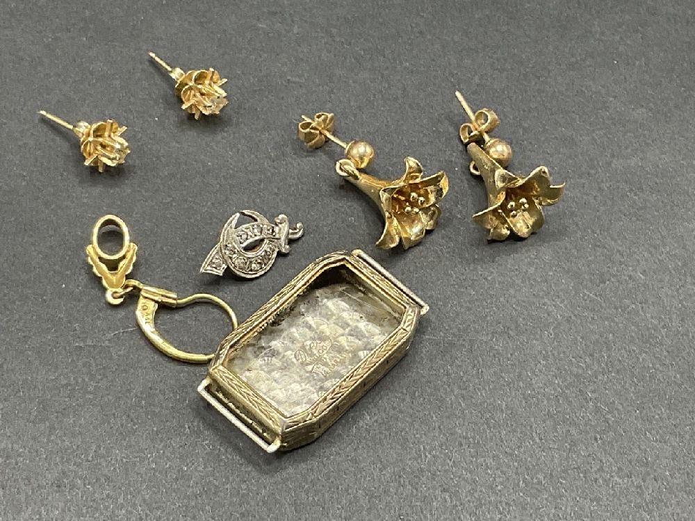 Two pairs of 14K gold earrings. Floral and diamond studs. Additional estate 14k gold findings.
