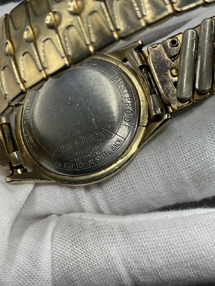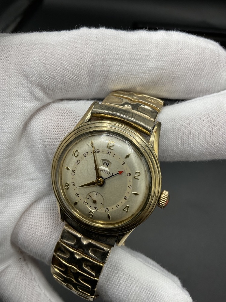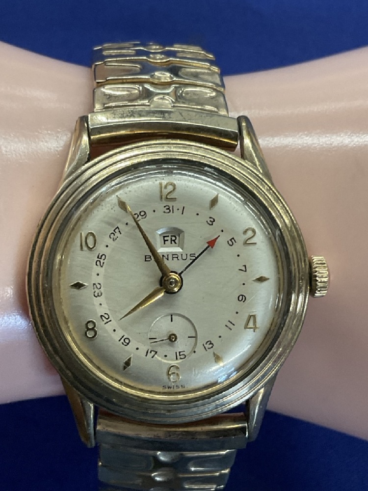 Vintage Benrus Points Calendar Day Date Wristwatch. In working order, not original band. Rolled gold plate.