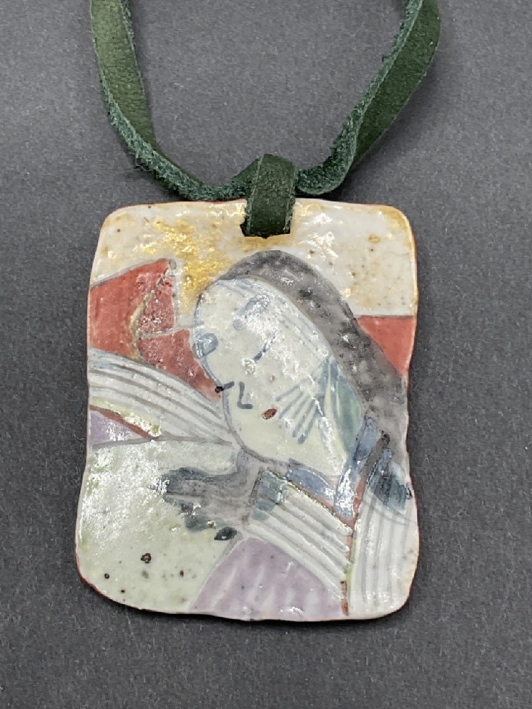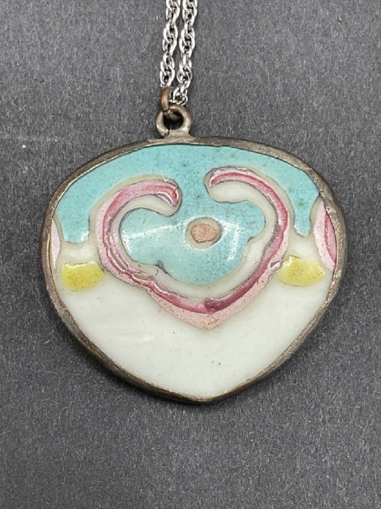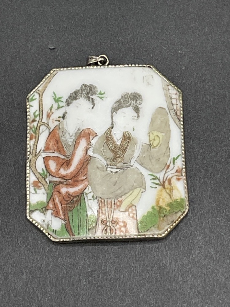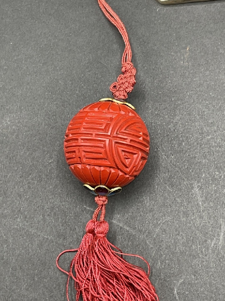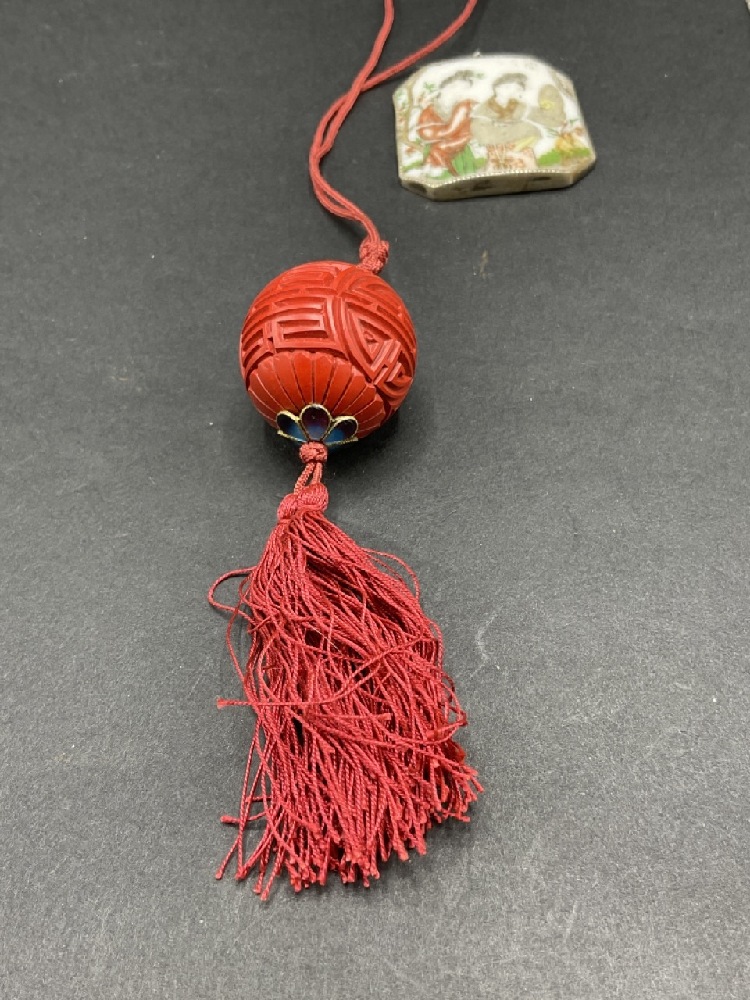 Estate Chinese Porcelain Shard Pendants and One Carved Cinnabar Shou Bead Ball tassel with enamel work