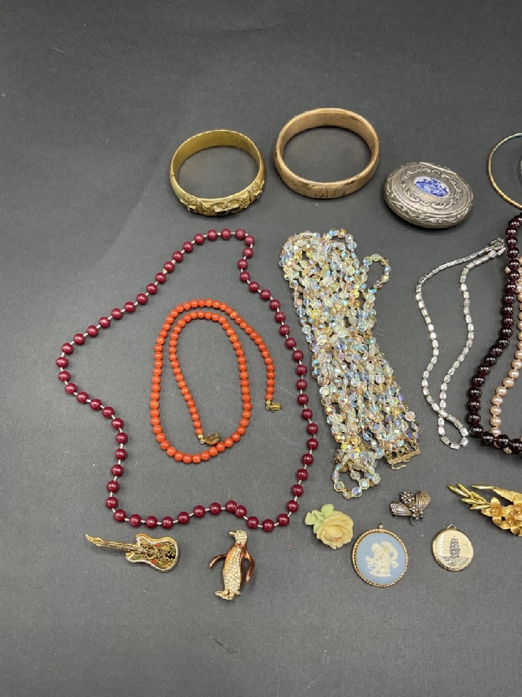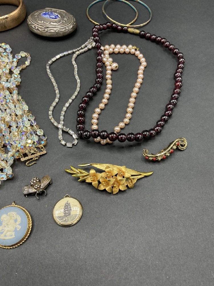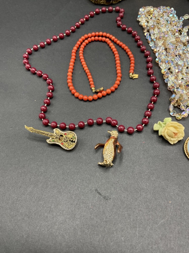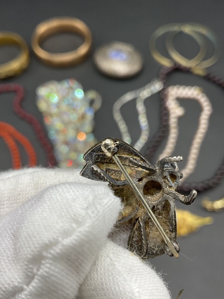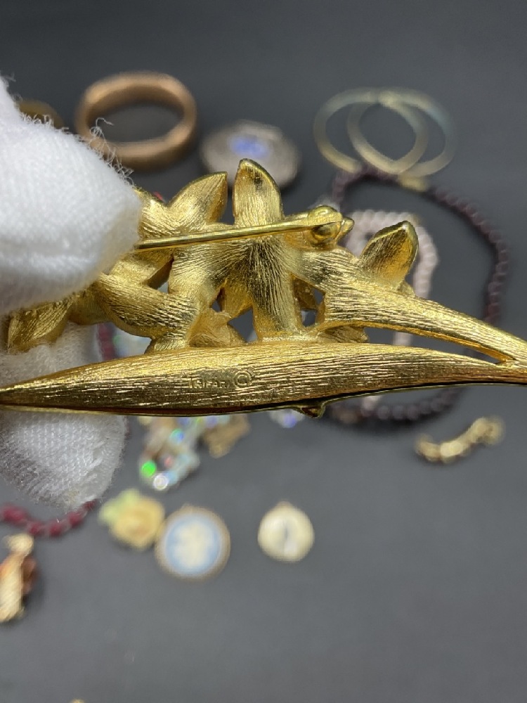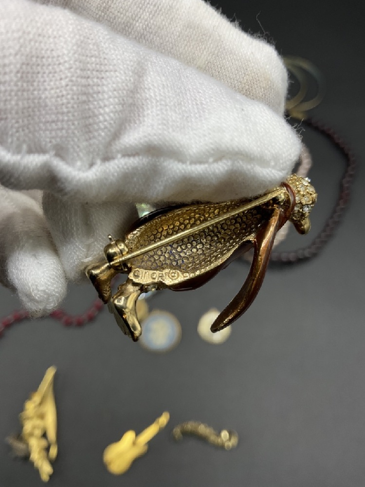 Compiled vintage costume jewelry lot. Includes a sterling silver wasp, Wedge wood, Gerry’s, Trifari and Ciner signed pieces.