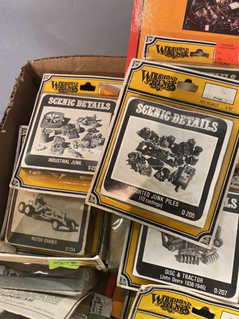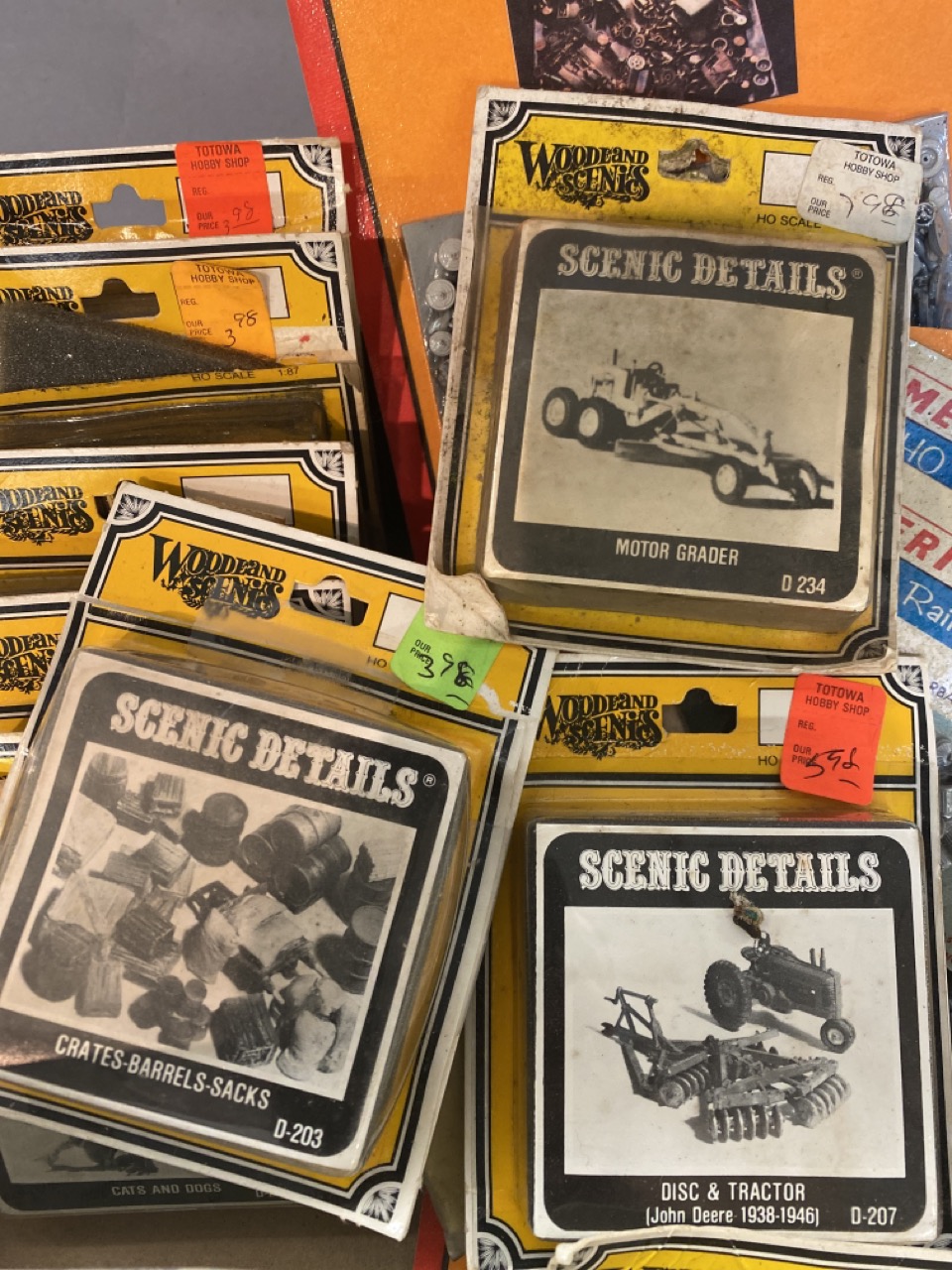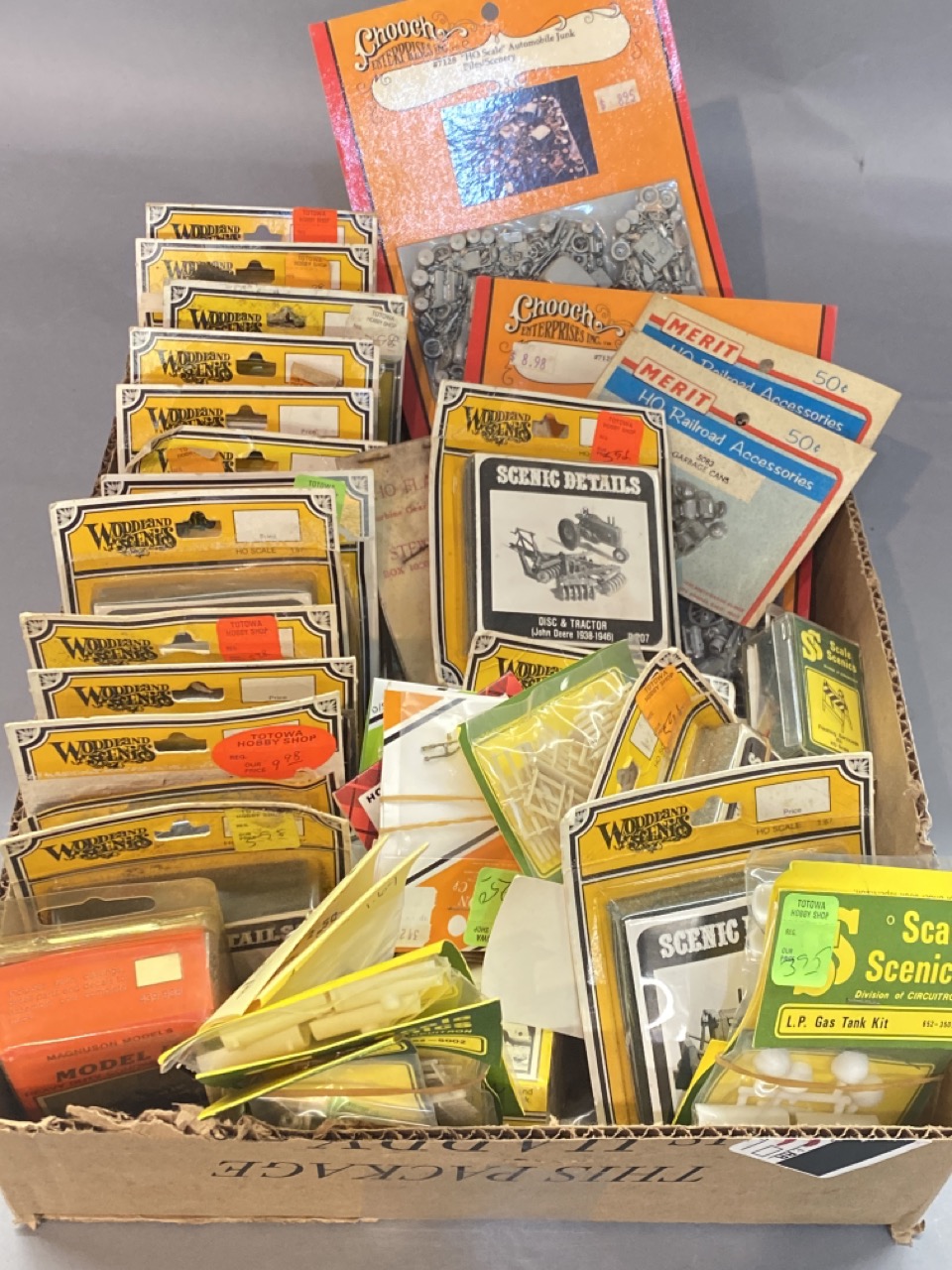 35 piece Woodland Scenics, Chooch Enterprises and Scale Scenics HO new old stock packaged HO train set up accessories.