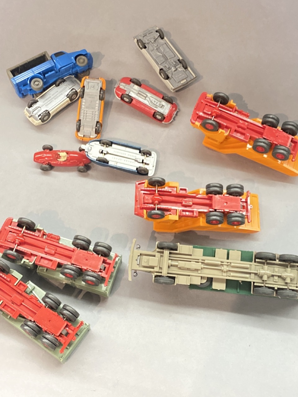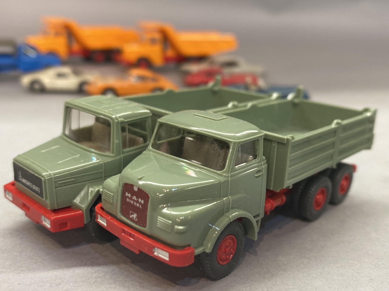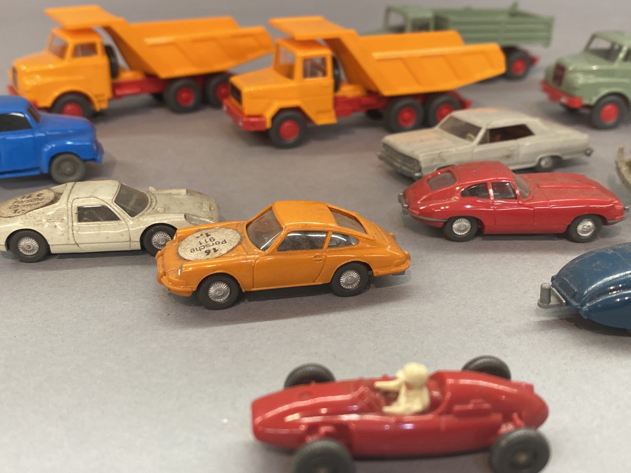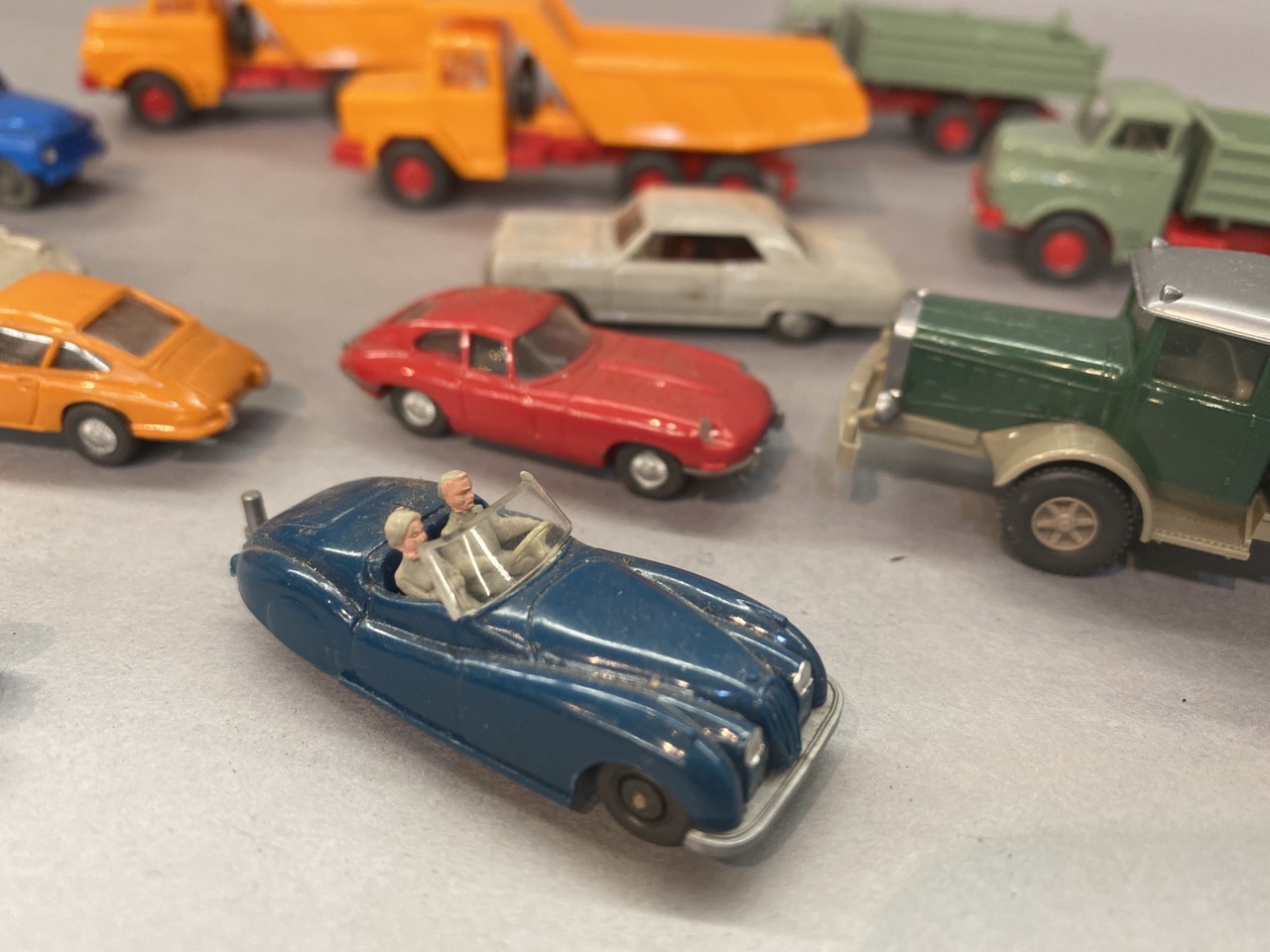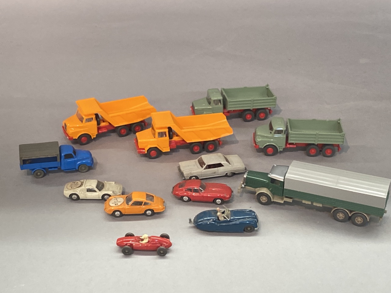Twelve (12) vintage German HO vintage plastic vehicles. All made by Wiking.