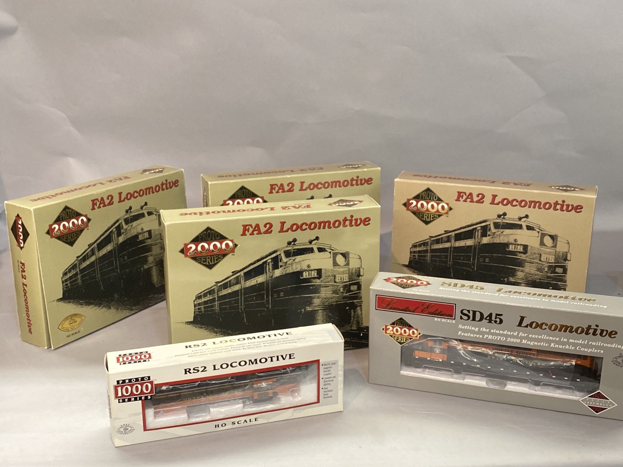 Six (6) Proto series train sets FA2 ,SD 45 and RS 2 . New in box.