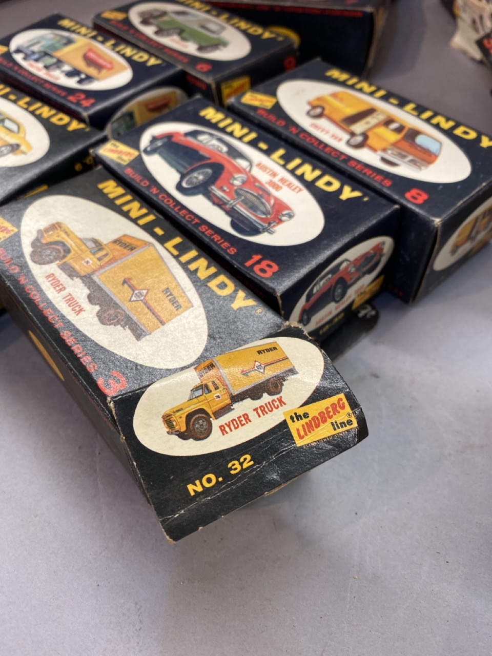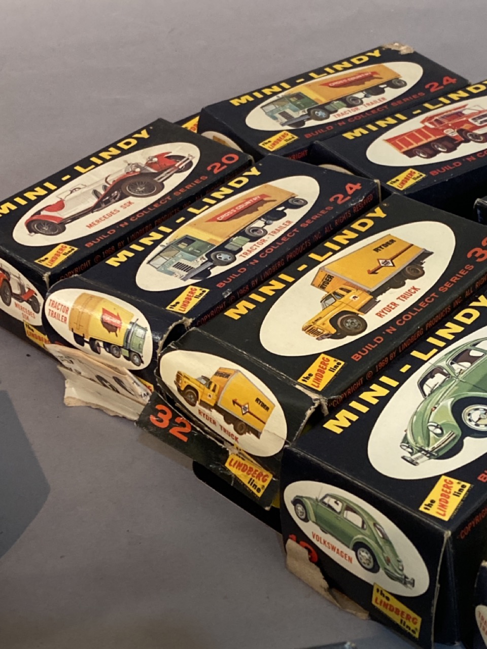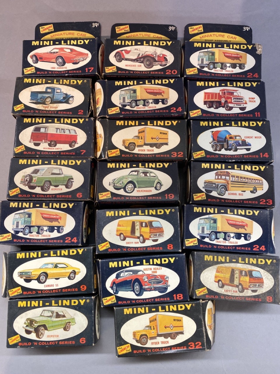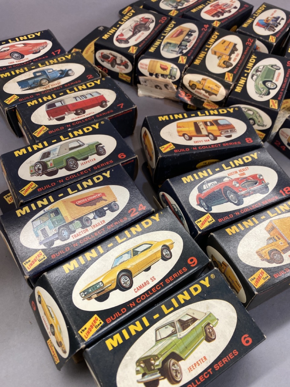 Twenty (20) vintage Mini-Lindy model cars. Some boxes have wear. All models complete and unused. Please see photograph preview or call.