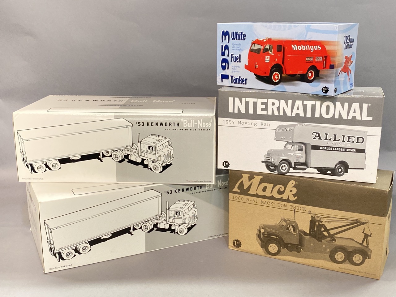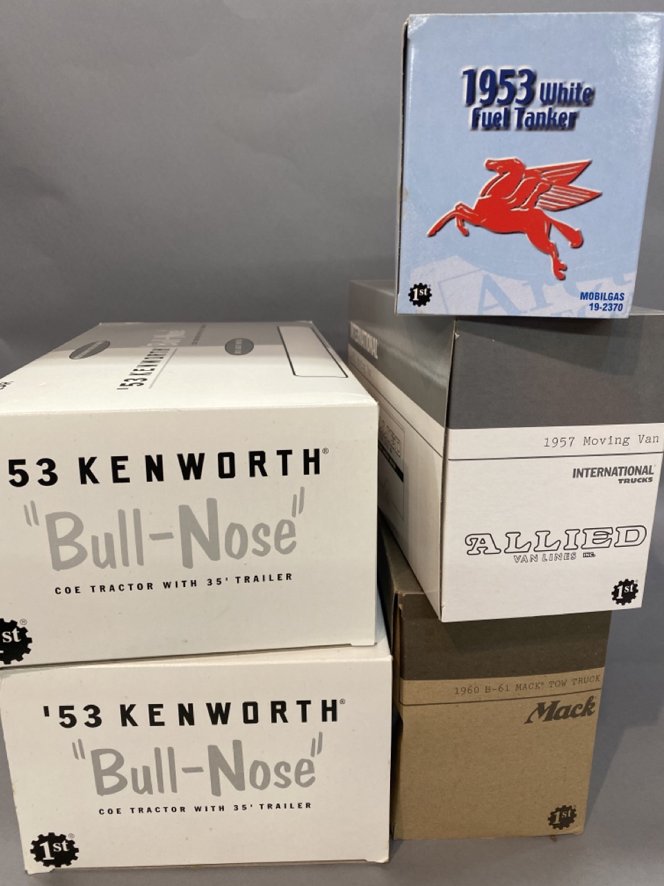 Five collector trucks by First Year Including the 1953 Kenworth Bull-Nose 1957 Moving Van, 1960 MACK tow truck and the 1953 Mobil gas tanker. All new boxed.