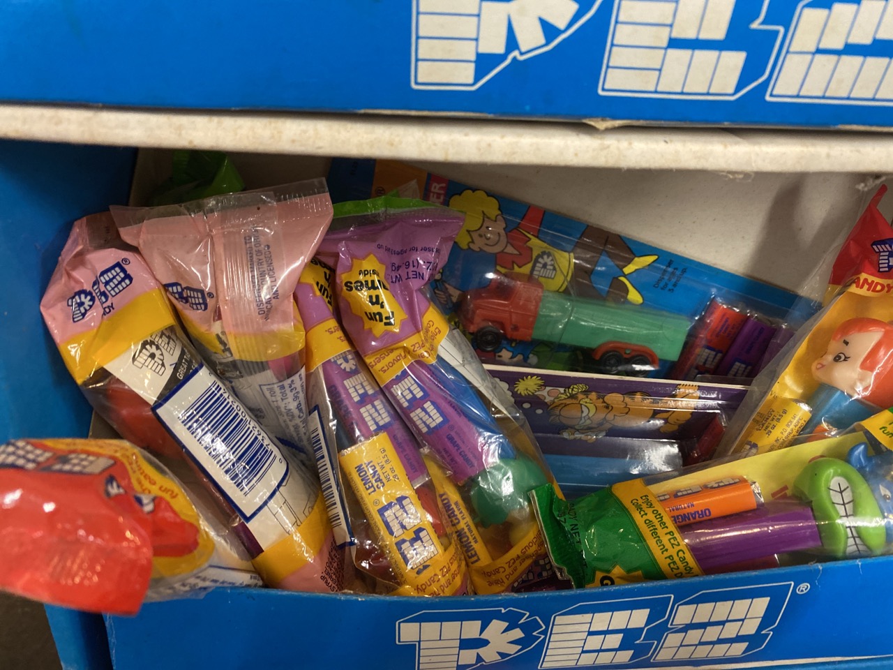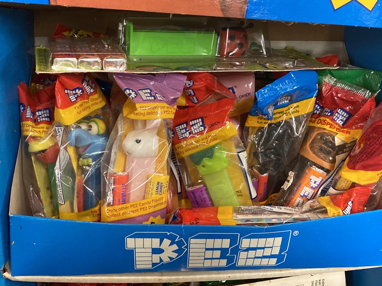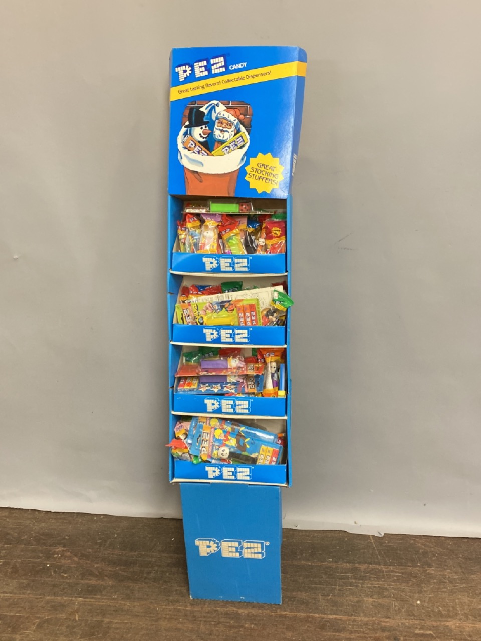 Vintage PEZ store display with fifty-six (56) assorted packaged Pez dispensers.