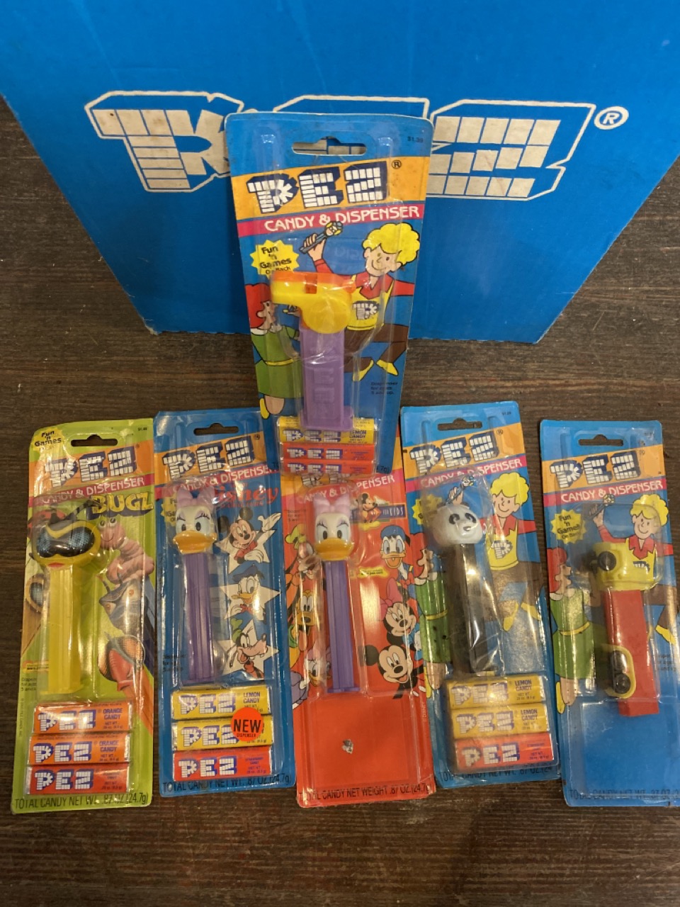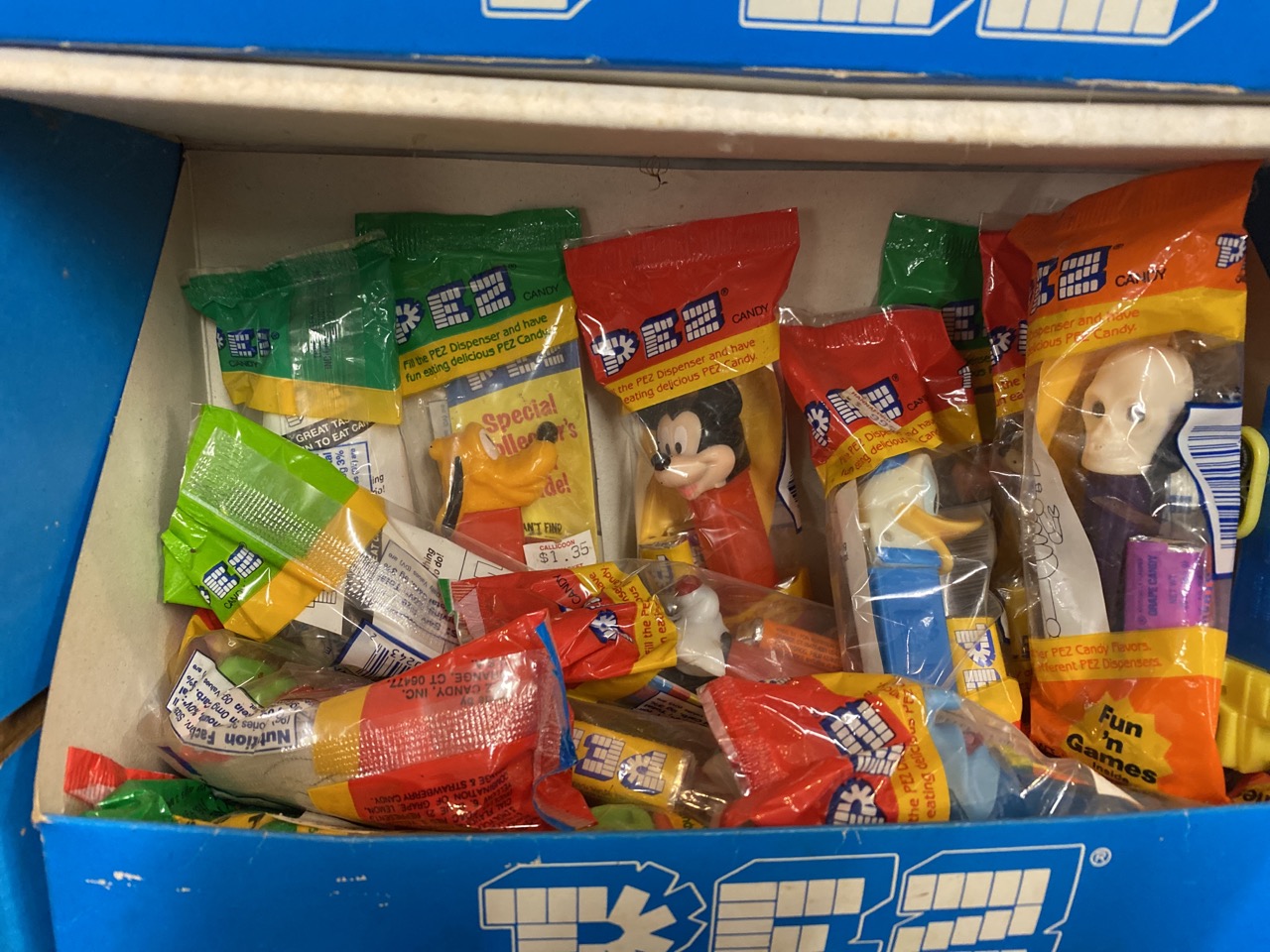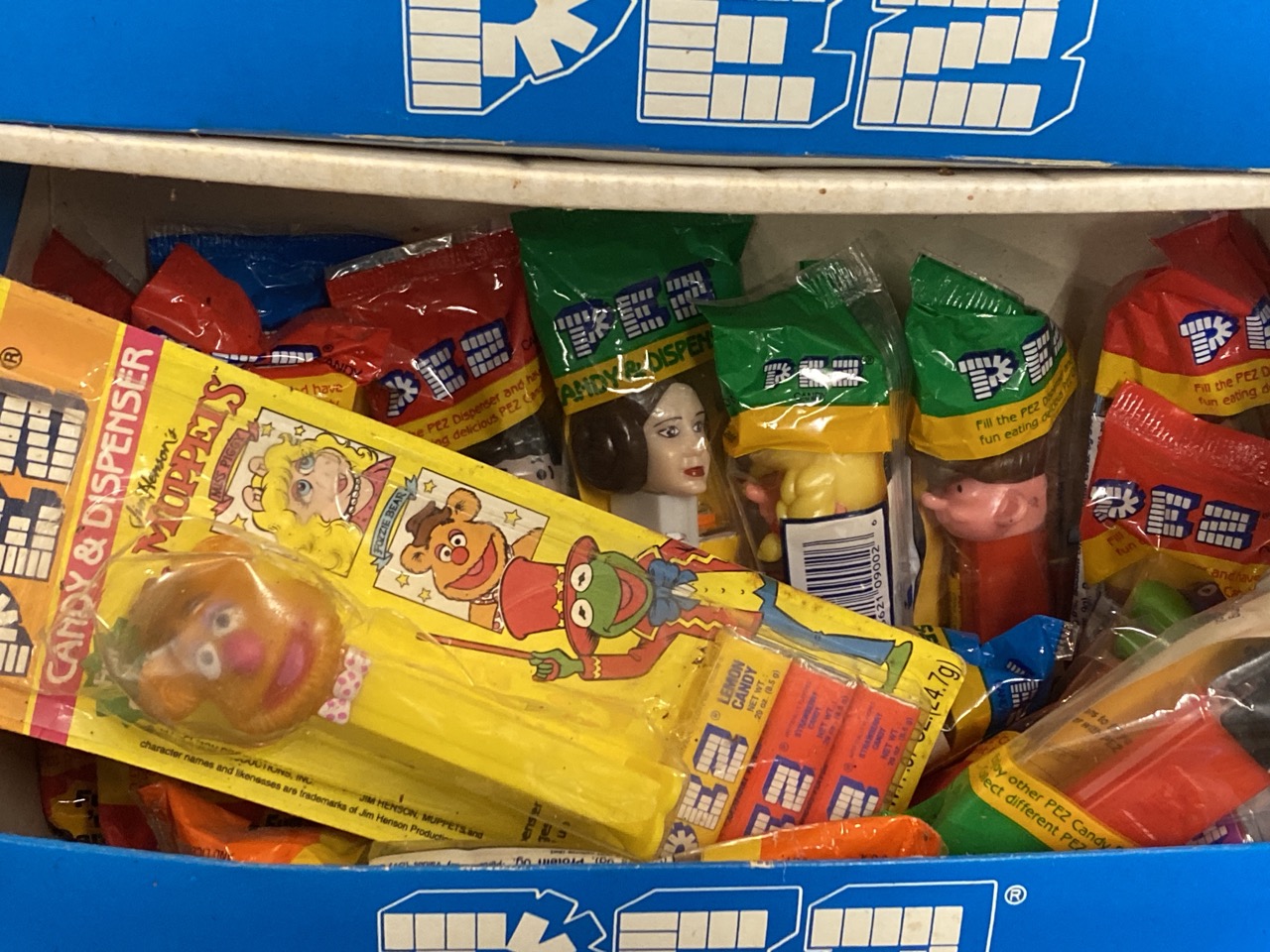 Vintage PEZ store display with fifty-six (56) assorted packaged Pez dispensers.