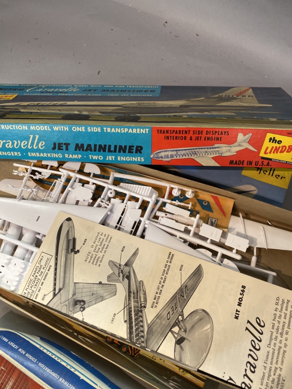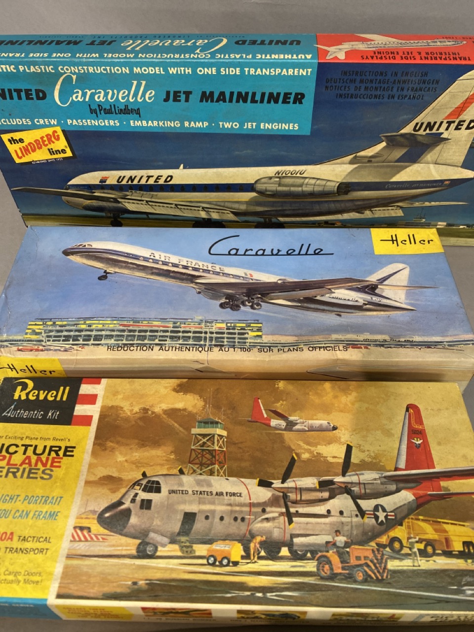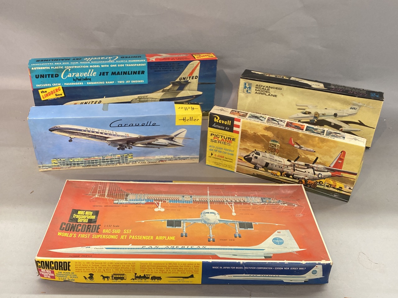 Five (5) Airline Models lot 1960’s Era Heller Caravelle, Air France,, Pan American Concorde Revell US Air Force, Lindberg line Caravelle United Airlines and Advanced Scale Model airplane Lear Jet N470 J