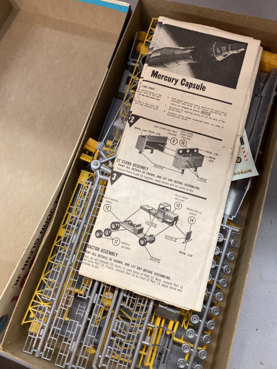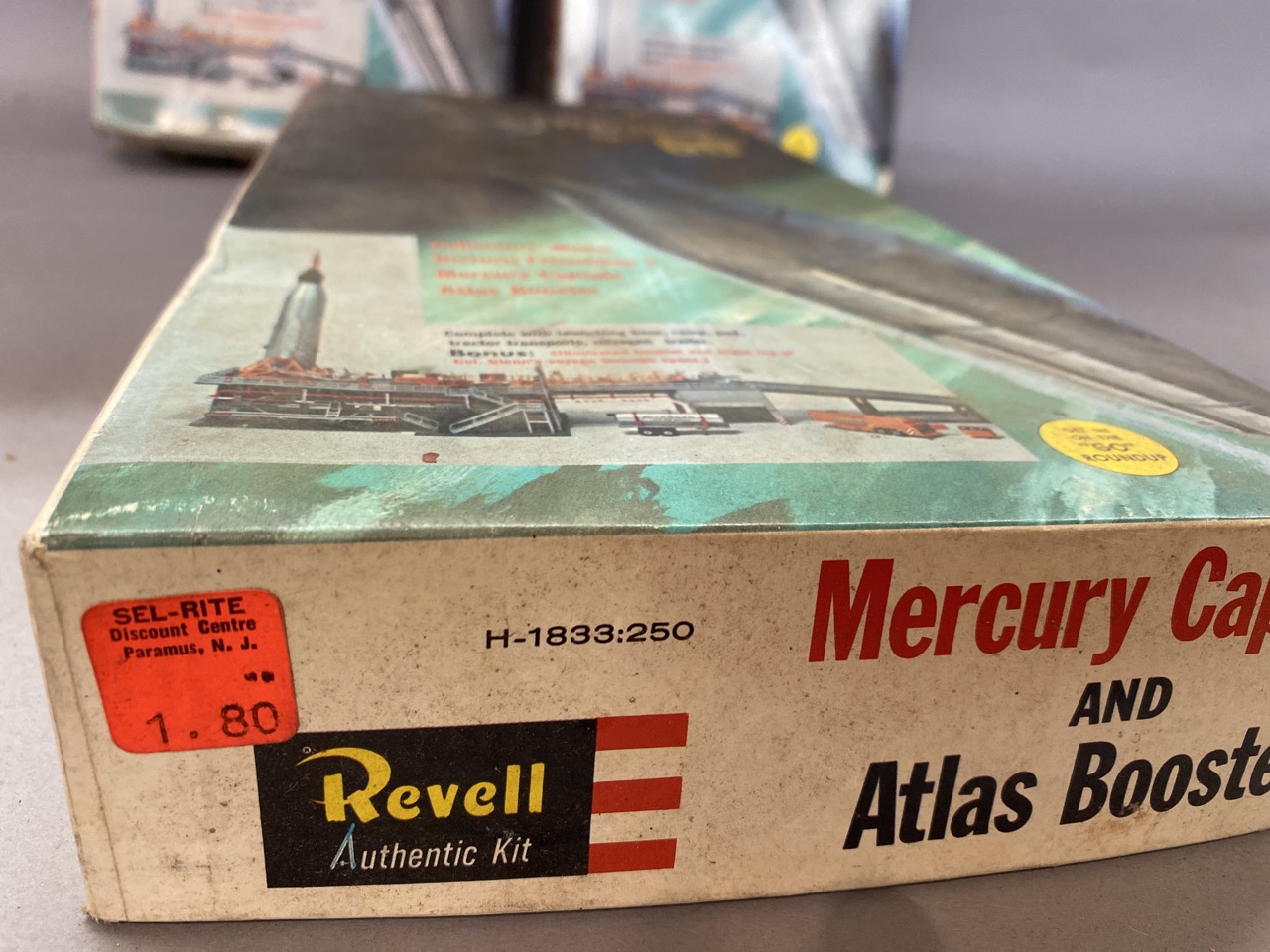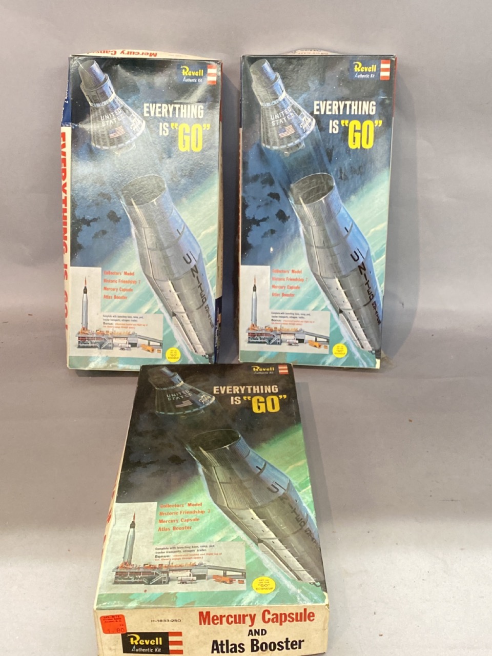 Three (3) original Revell everything is “ Go” 1960's Friendship 7 Mercury Capsule and Atlas Booster. Undone models. New/Old Stock.