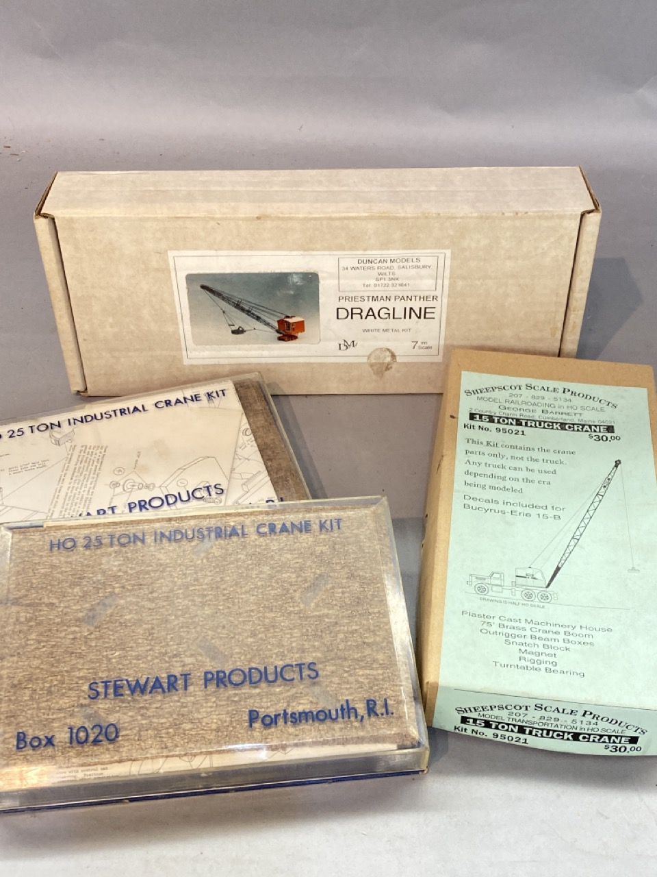 Four (4) industrial crane models. HO 25 Ton Industrial crane kit by Stuart products Portsmouth Rhode Island, 15 ton truck crane by Sheepscot scale products and Priestman Panther Dragline