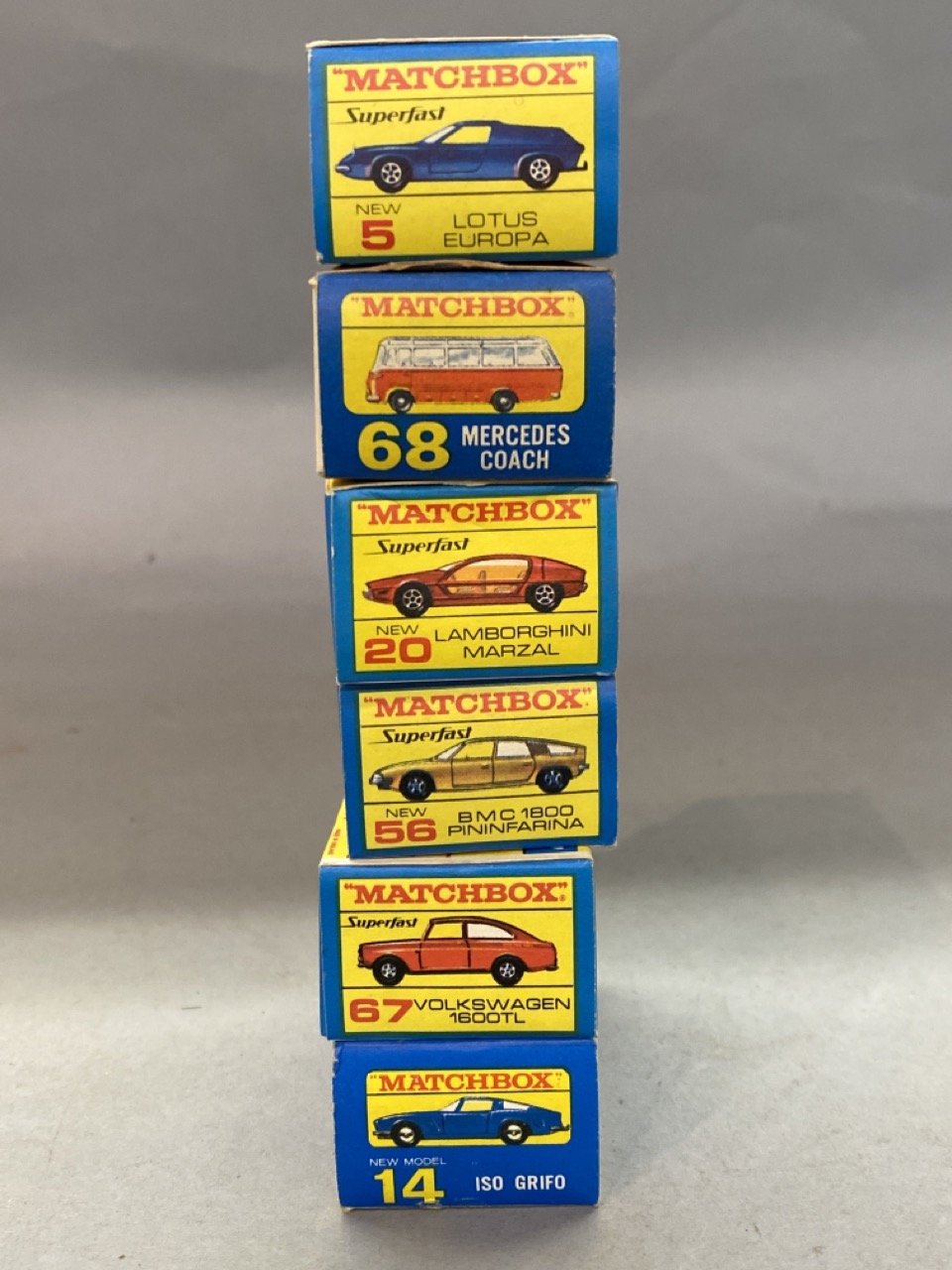 Six vintage Matchbox cars by Lesney including 5, 14, 20, 56, 67, 68, all with boxes. Very good.