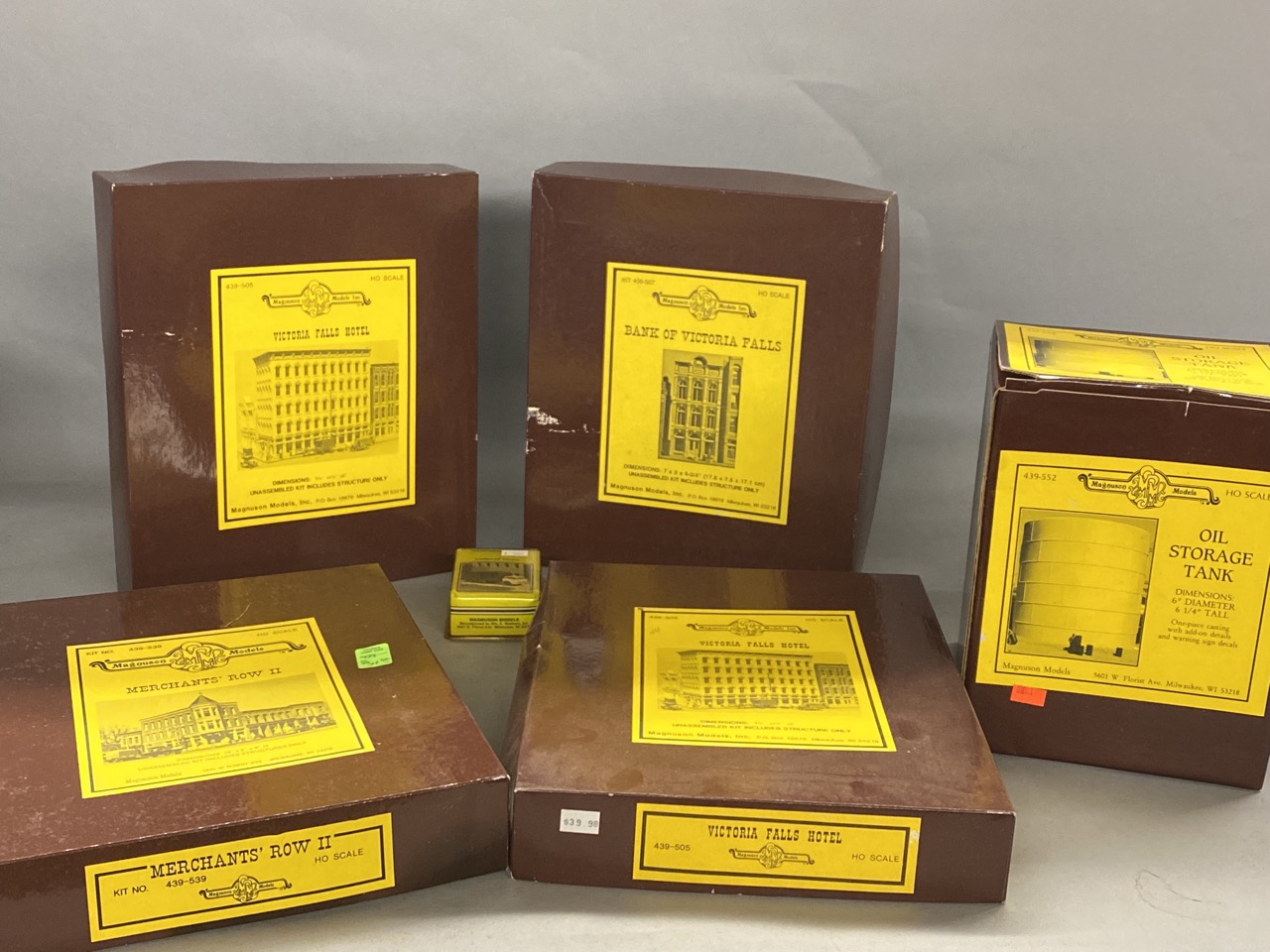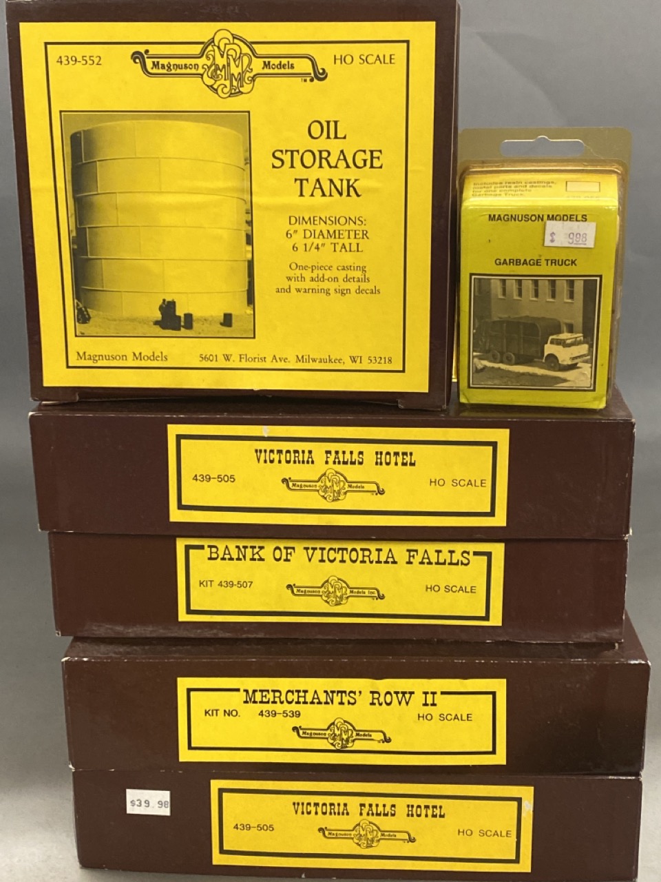 Six (6) Magnuson Models including Merchants Row , (2) Victoria Falls hotel , Bank of Victoria Falls, oil storage tank and garbage truck.