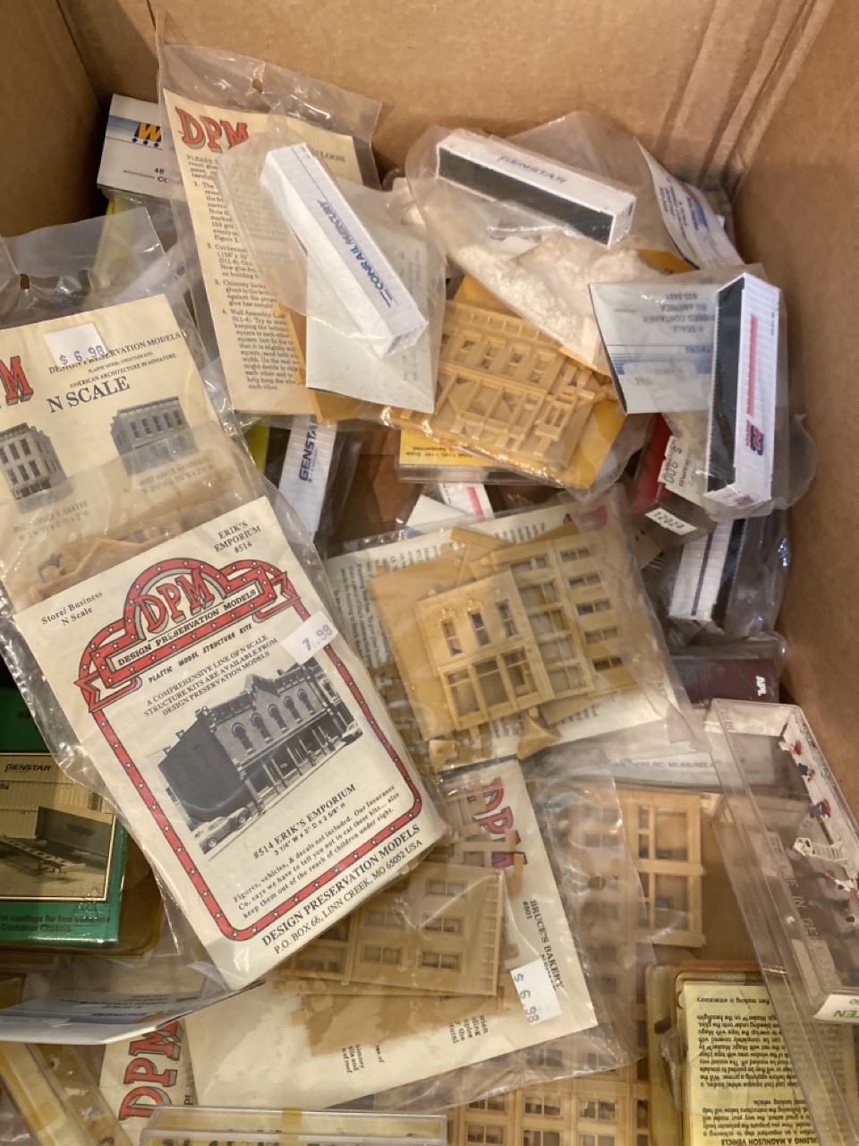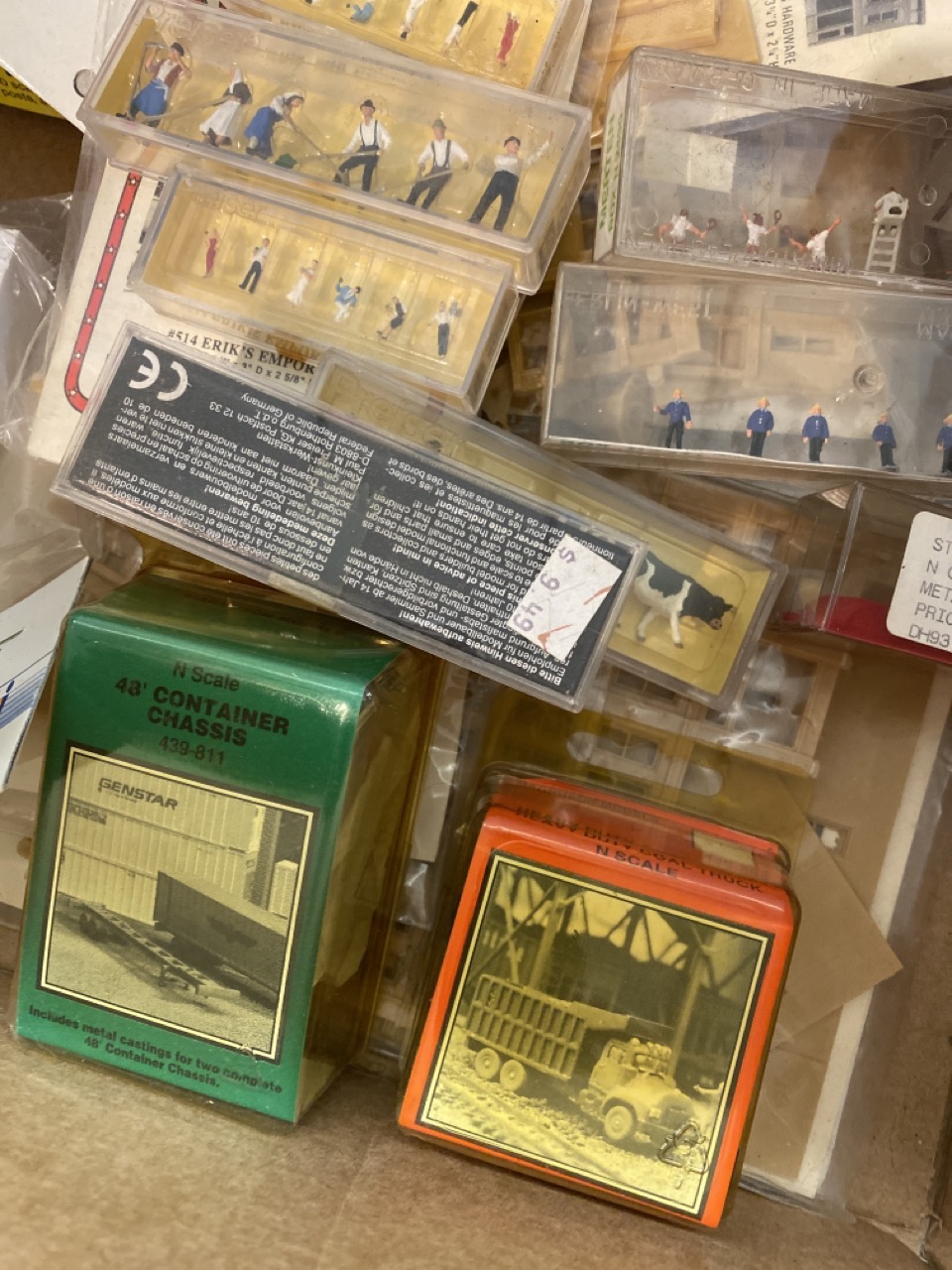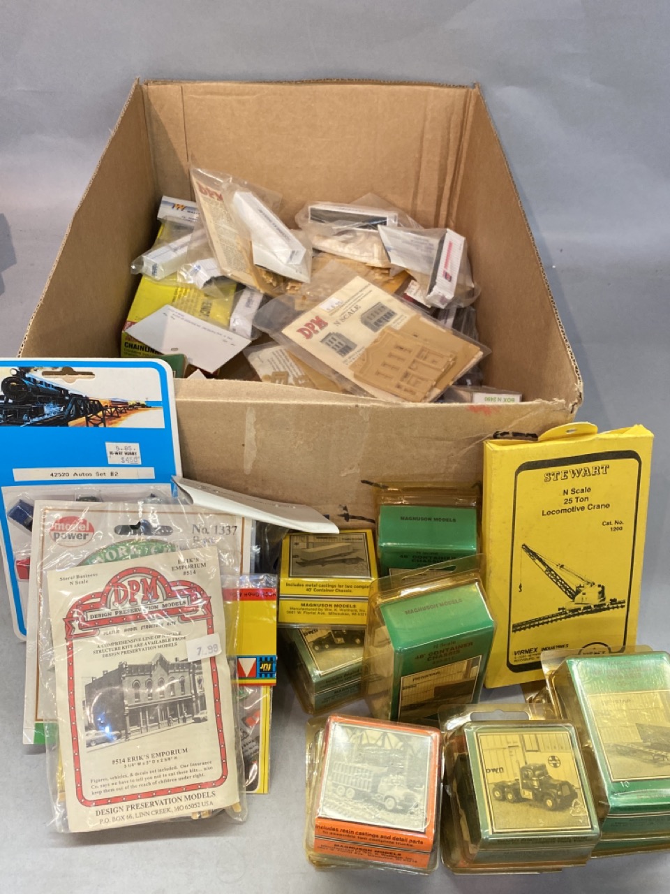 50 pc. N scale Train Model Accessories including Magnuson trucks and trailers, Preiser and Merten people, Walther’s , Stewart N scale Locomotive Crane by Virnex.