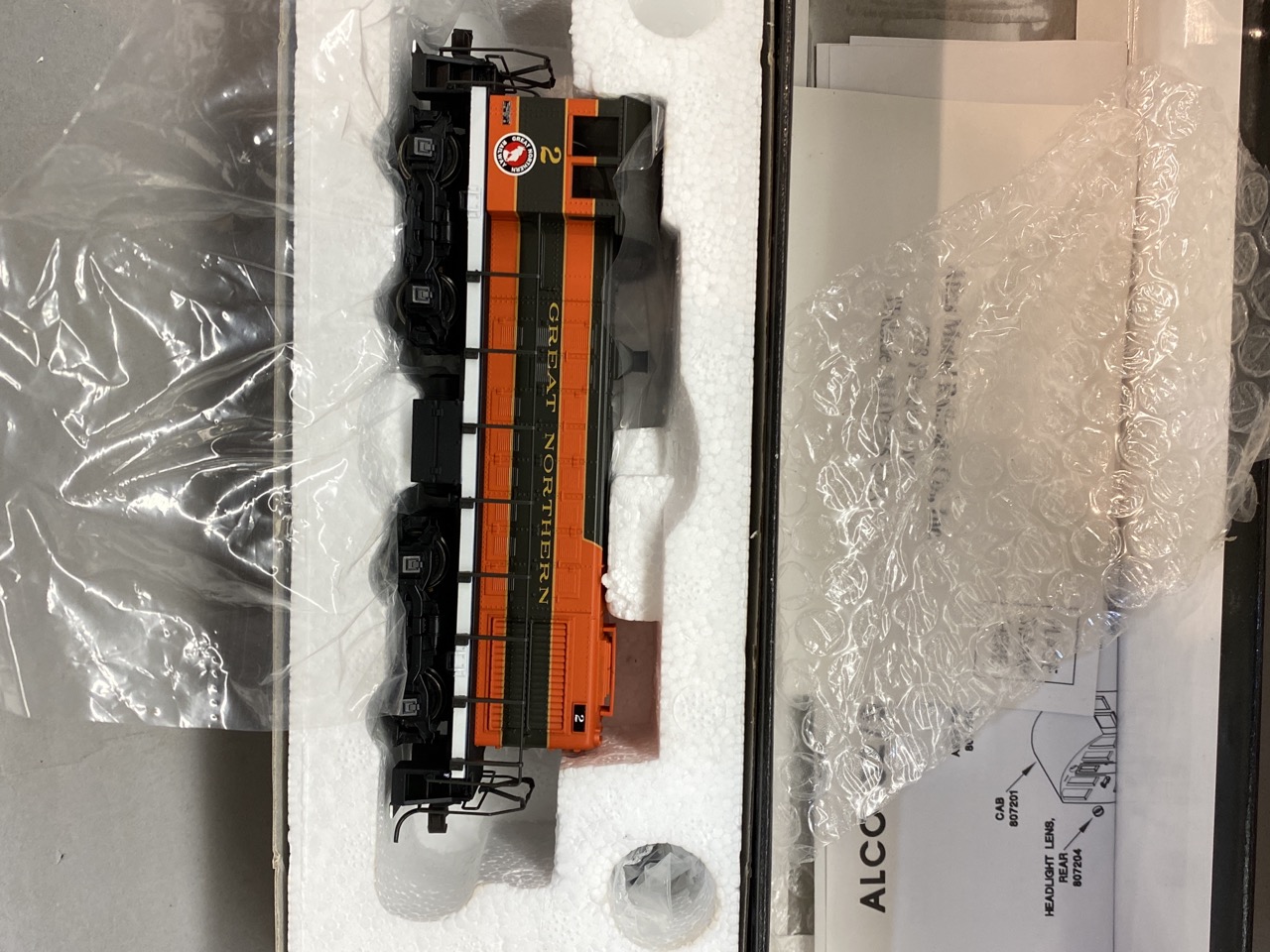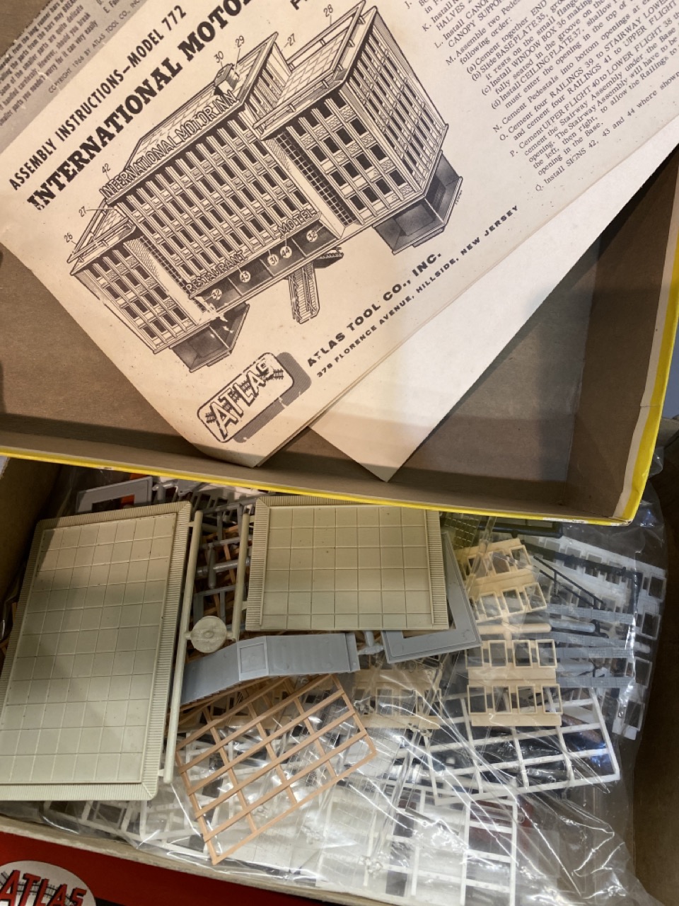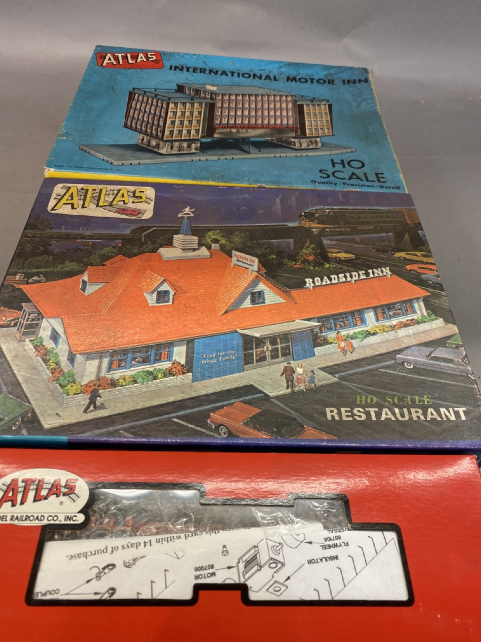Atlas HO scale model locomotive engine, boxed. Two vintage Restaurant and Motor Inn model kits. Unused.