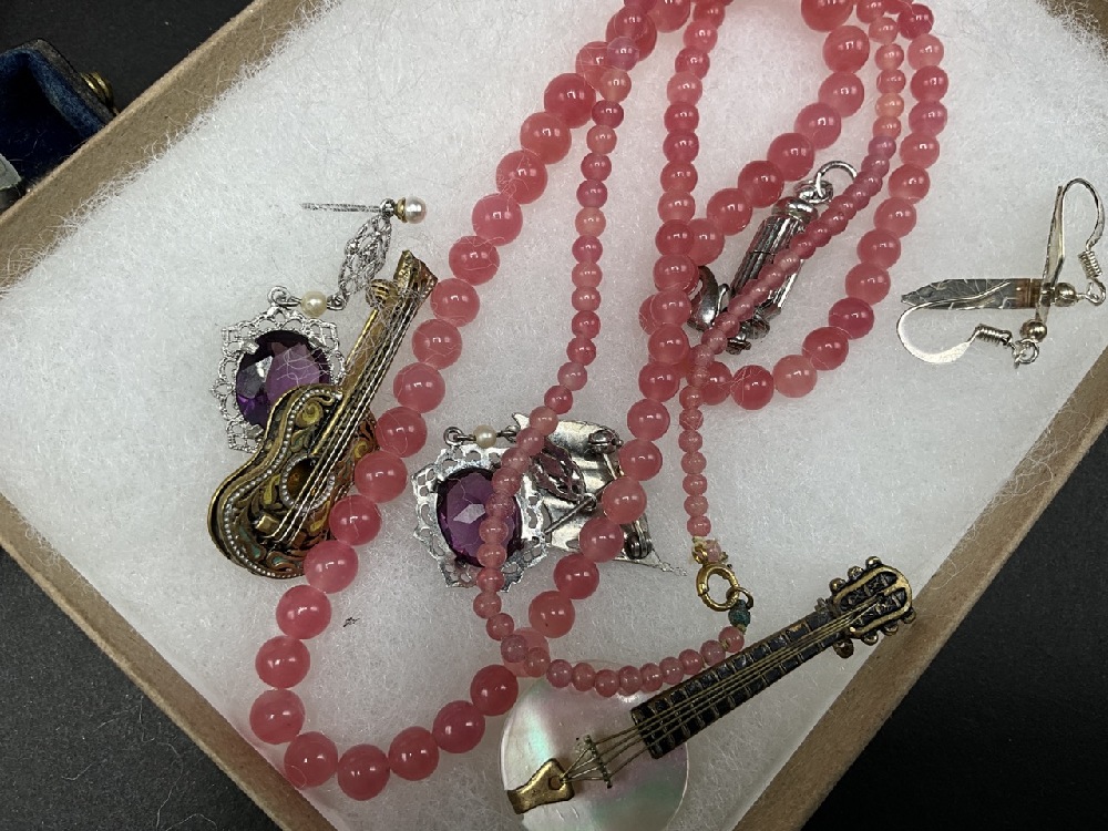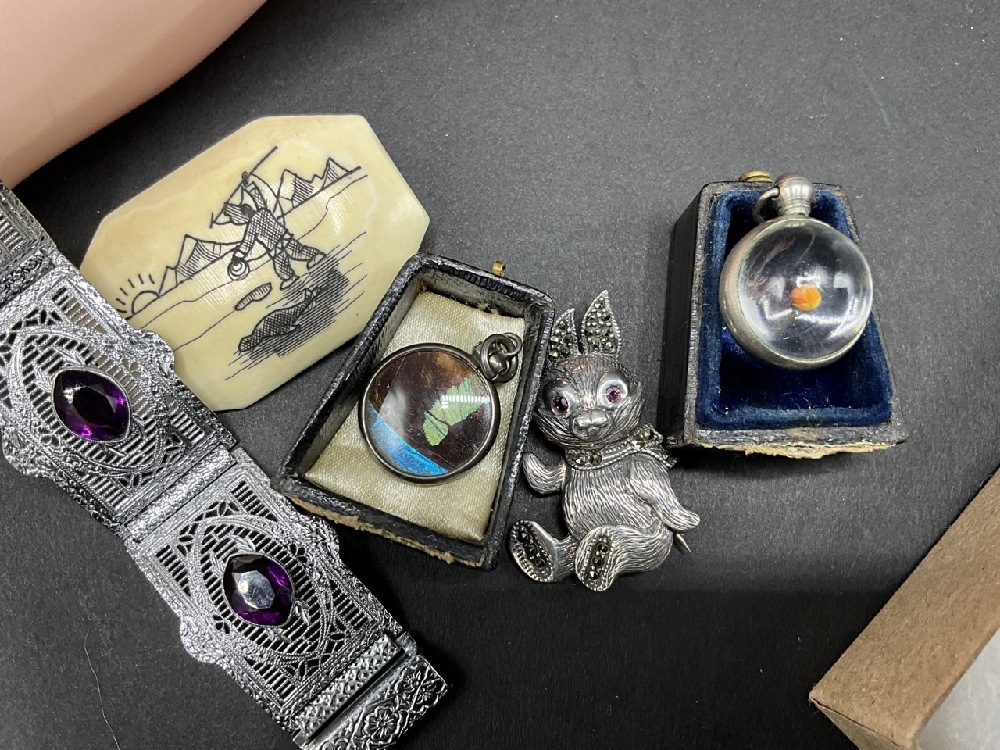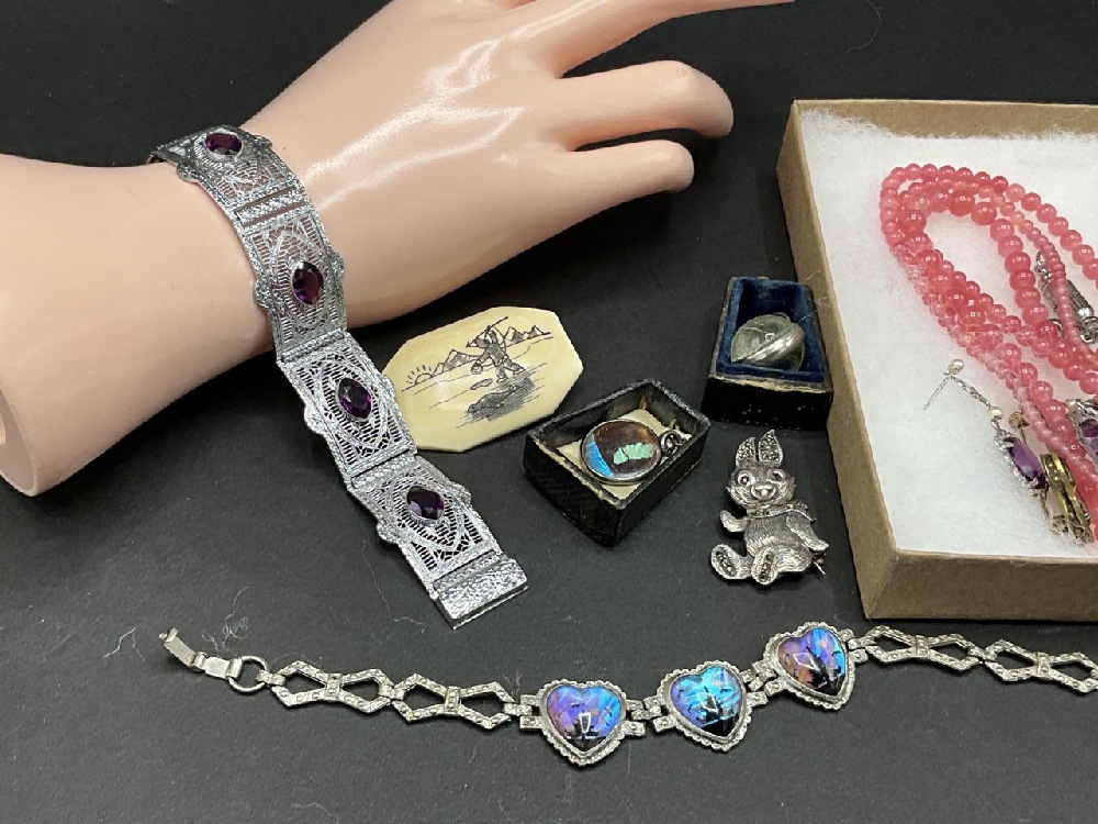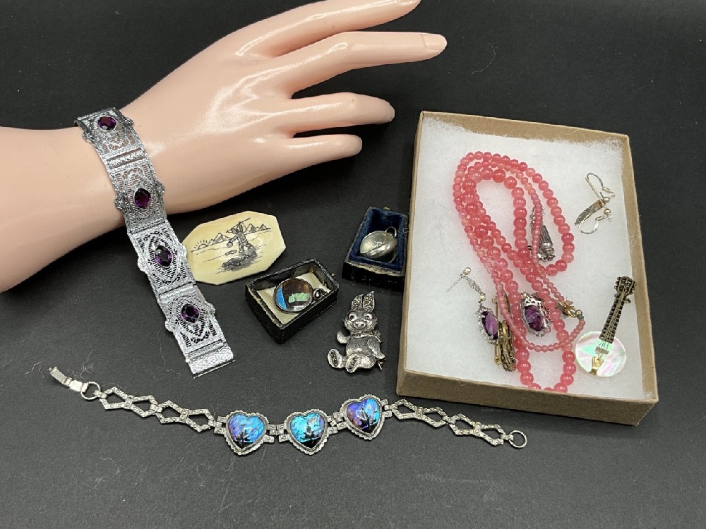 Compiled vintage jewelry group including bracelets, sterling silver, earrings and Inuit pin.