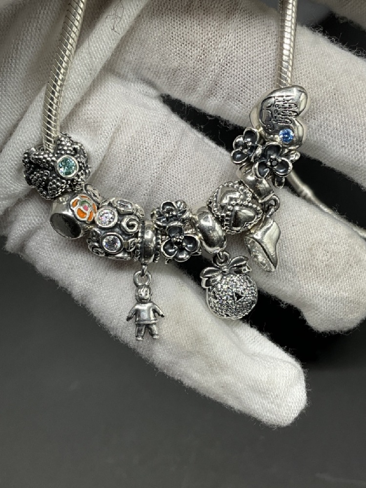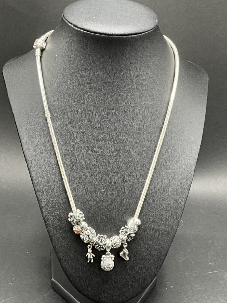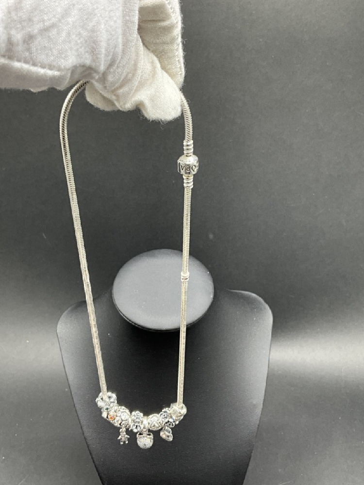 Pandora Sterling Silver Necklace and Charms.