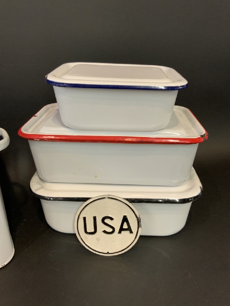 Tin Lot - Breadbox, USA Sign, Square Cannisters.