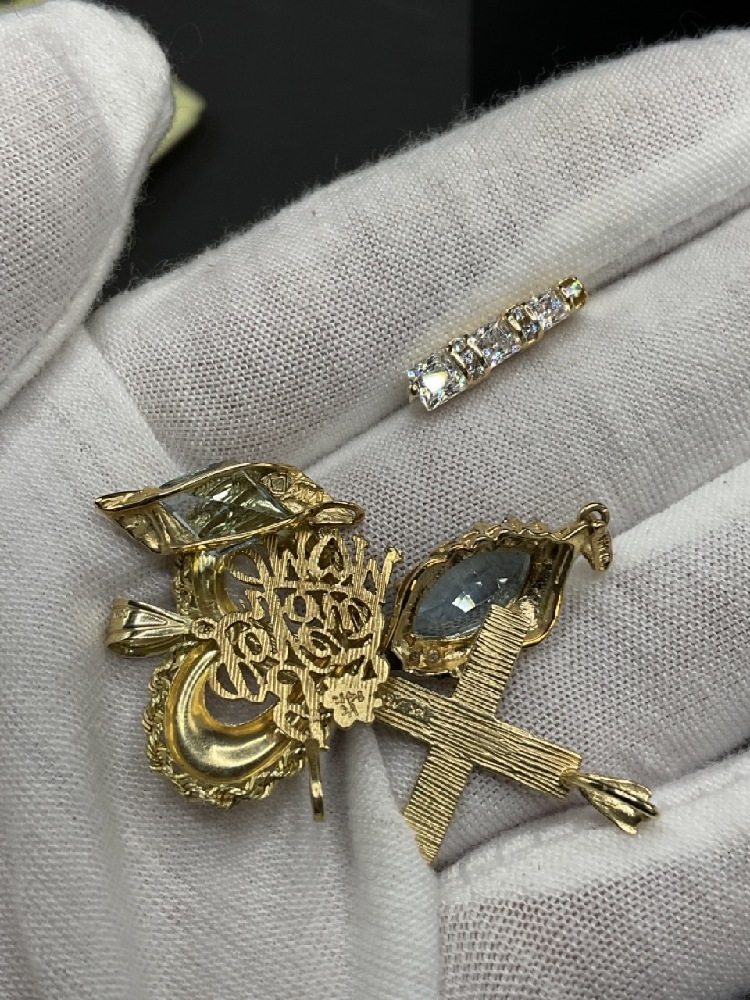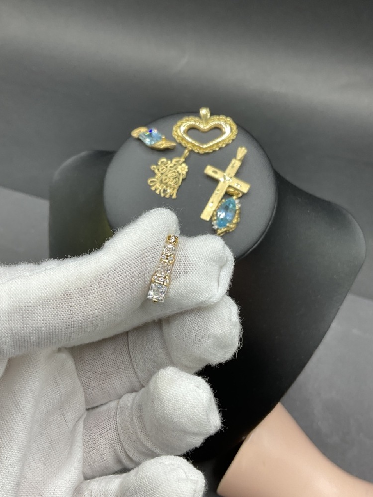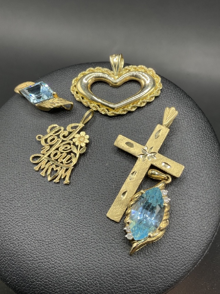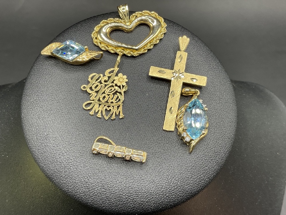 Six (6) 14K Yellow Gold Pendants. Cross, Heart, Blue Topaz and CZ slider pendant.