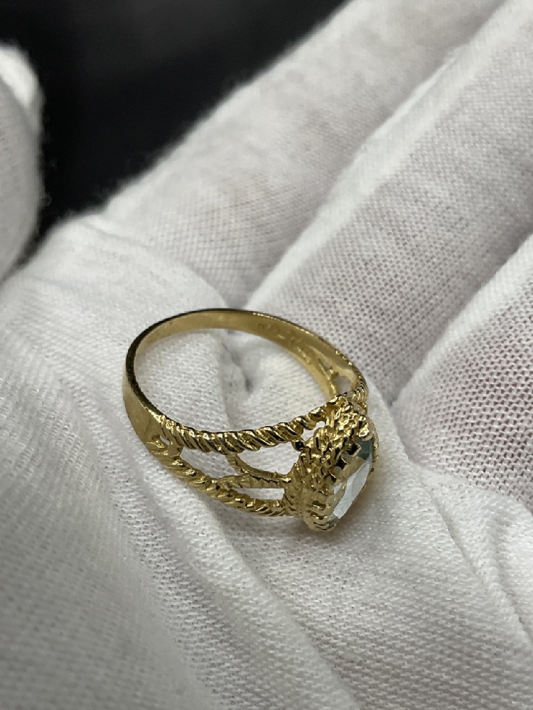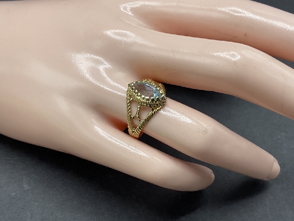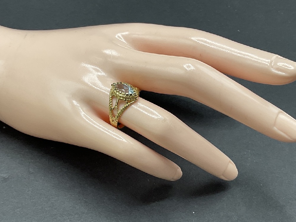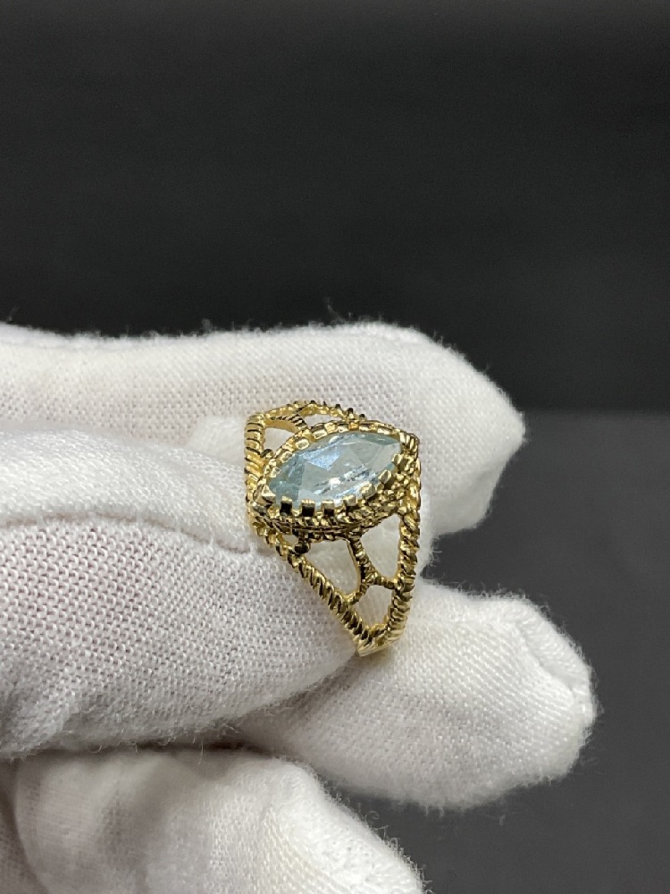 14k Yellow gold pear shaped aquamarine ring.