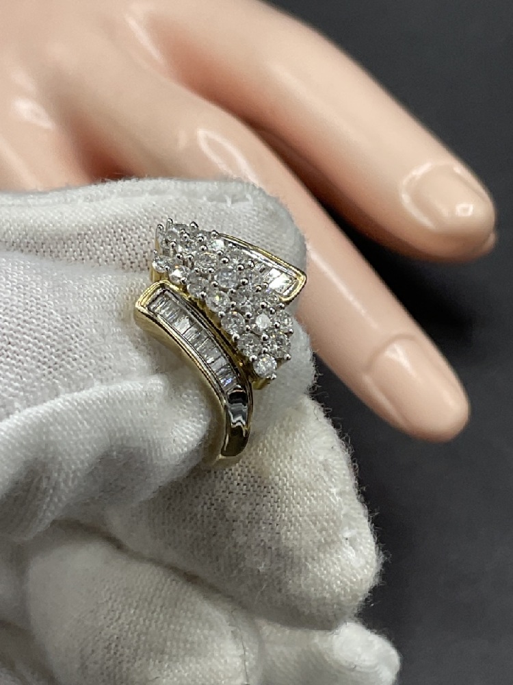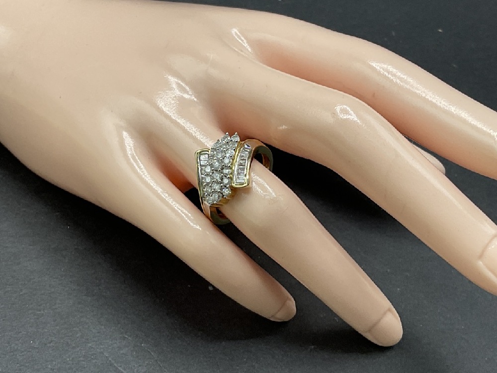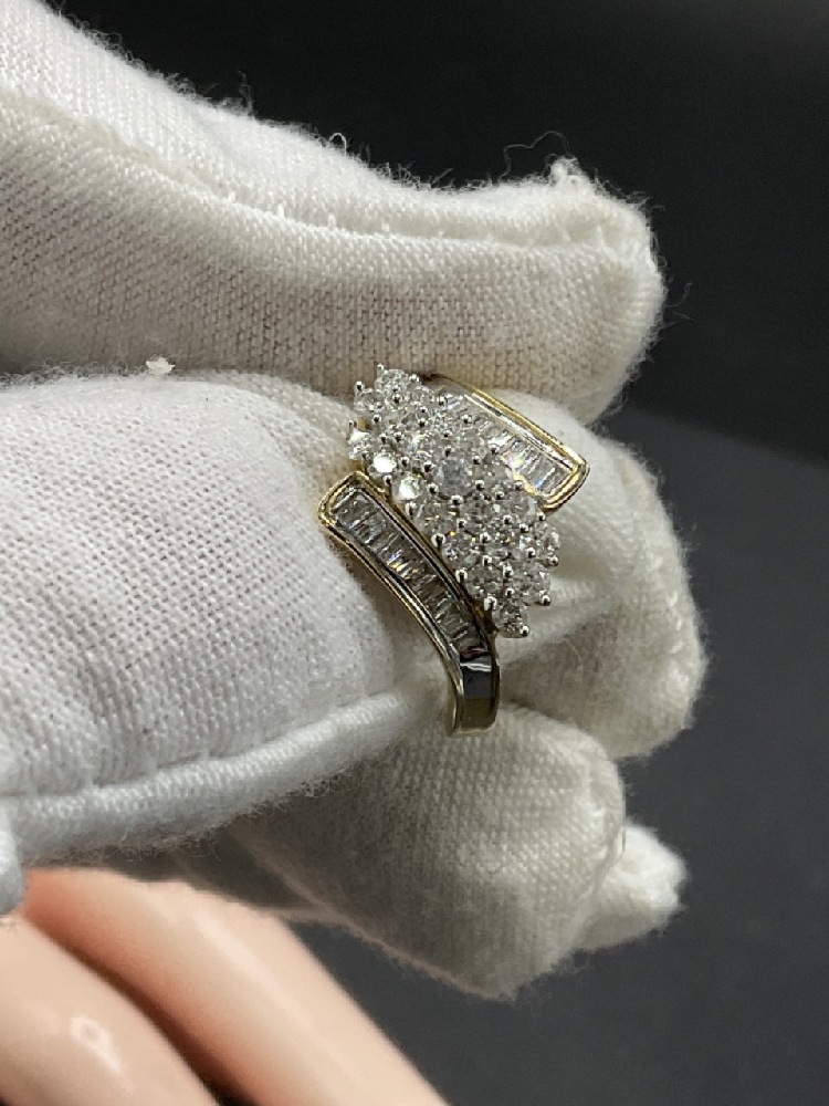 10K Yellow Gold Diamond Ring with 16 round diamond and side baguettes.
