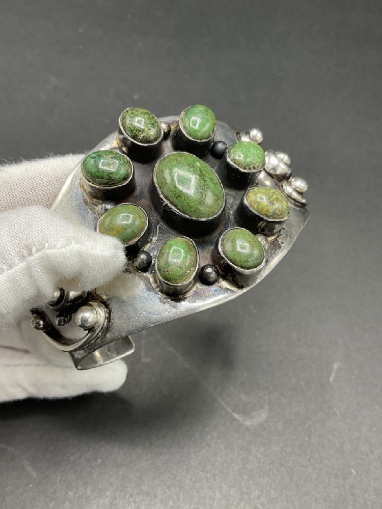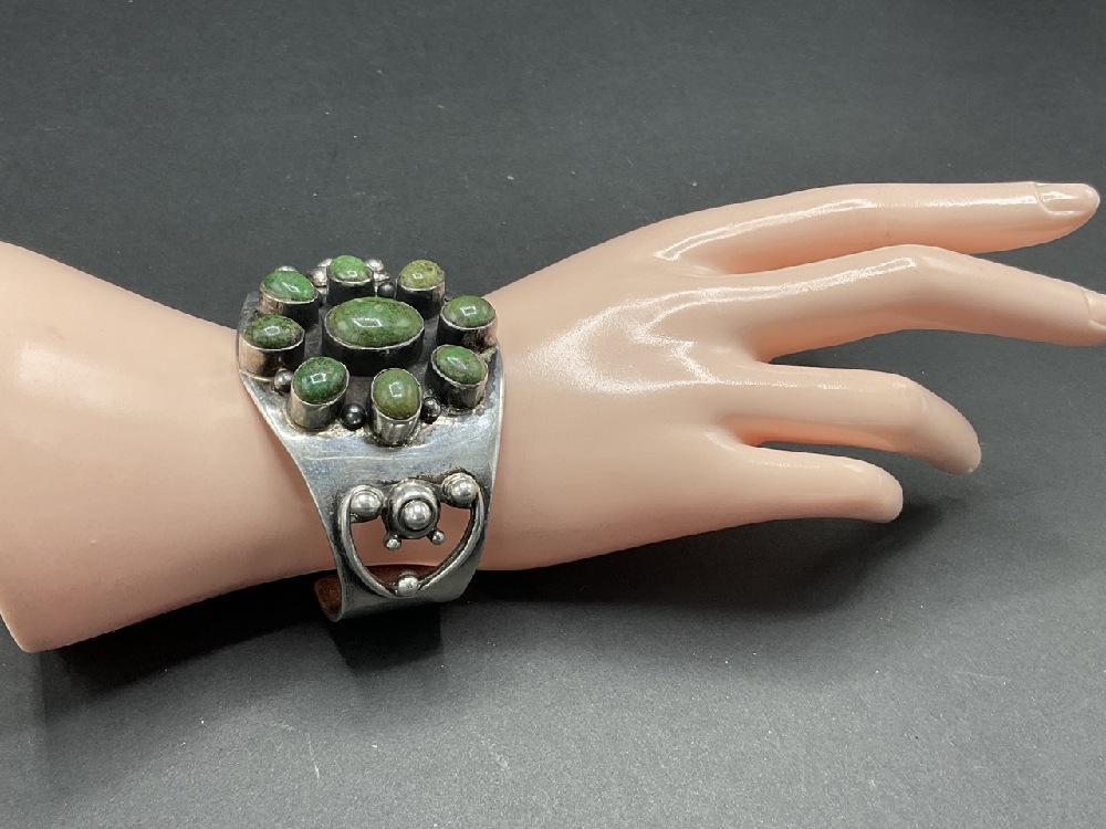 Los Ballisteros Taxco Mexican 925 sterling silver natural green turquoise cuff bracelet.