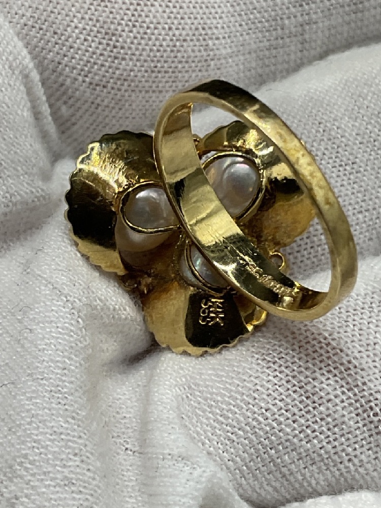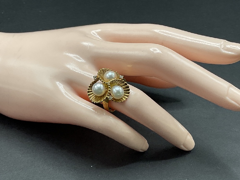 14K yellow gold ring with three freshwater pearls.