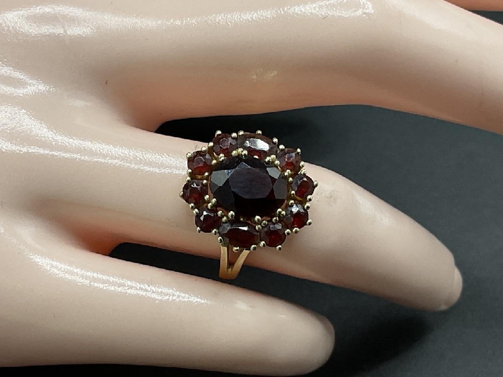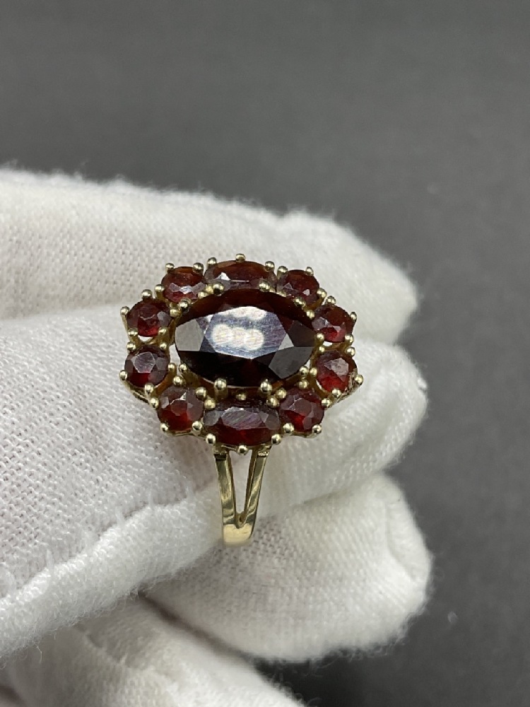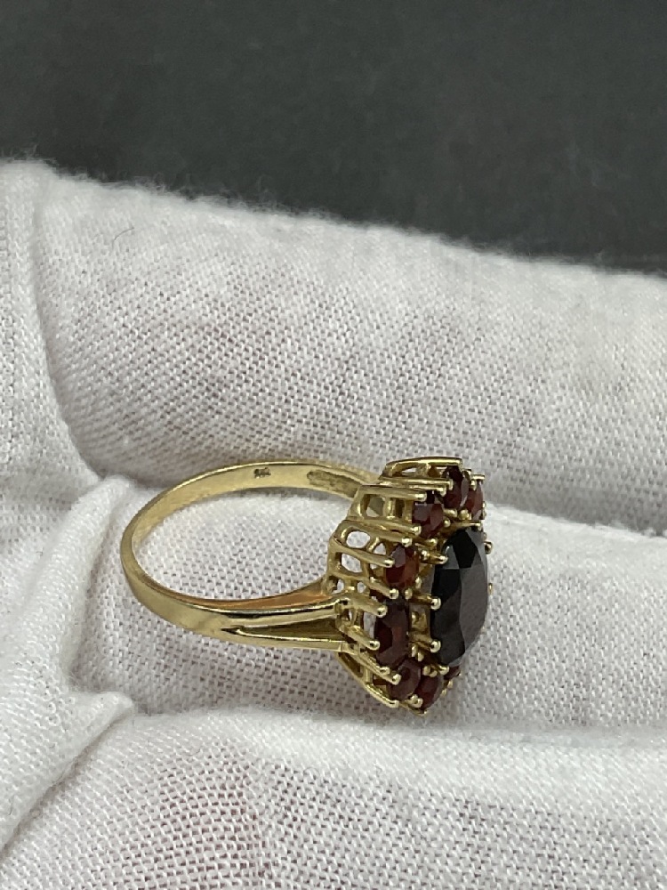 14K Yellow gold ring with garnet gemstones. One center garnet stone and ten smaller gemstones.