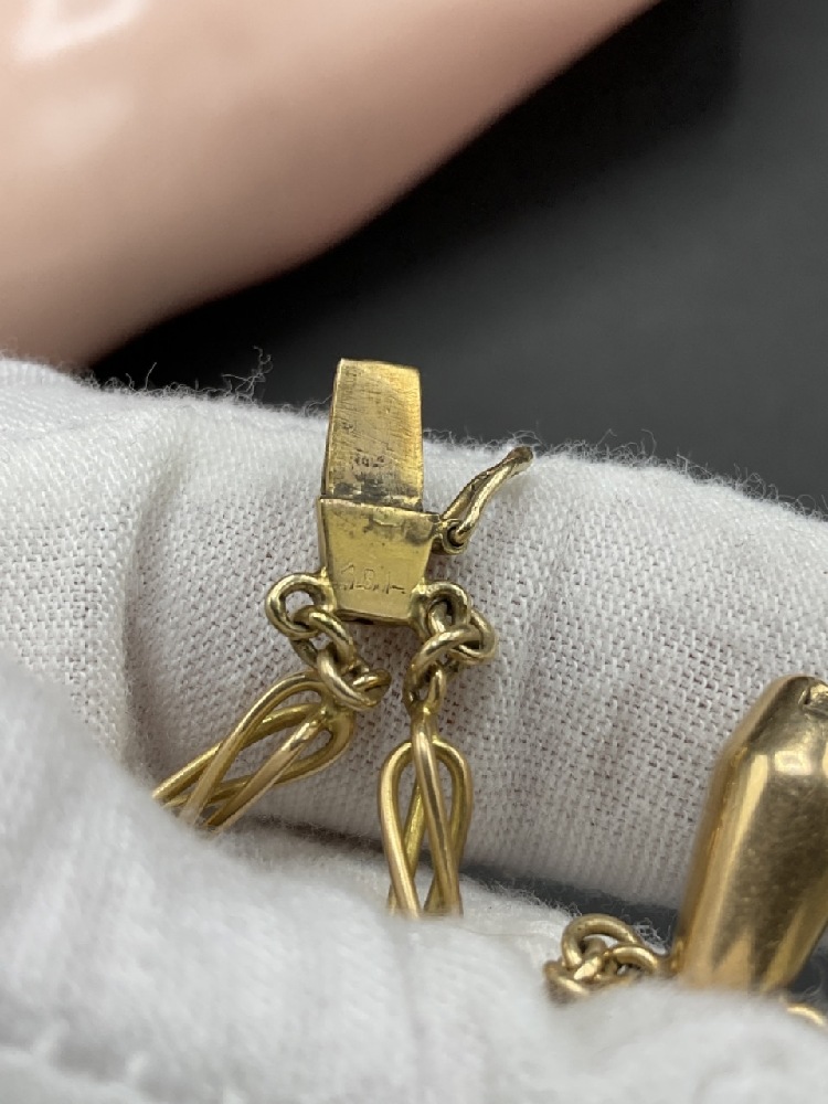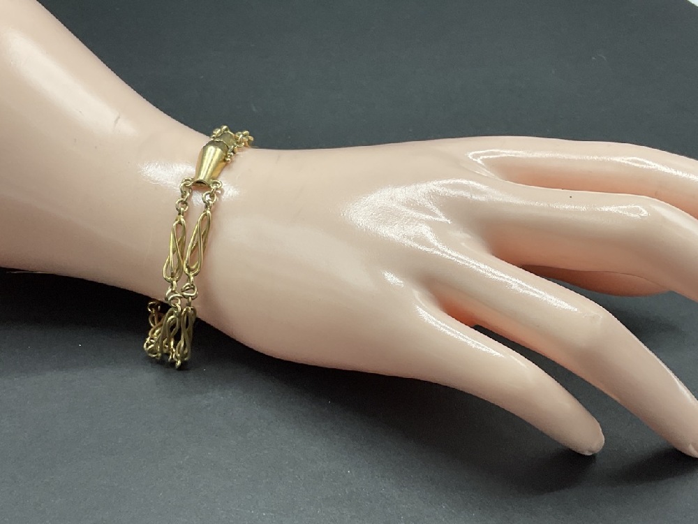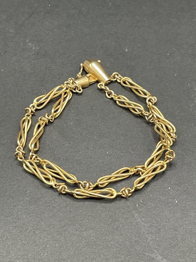 18K double strand gold link bracelet with thick vessel shaped clasp.