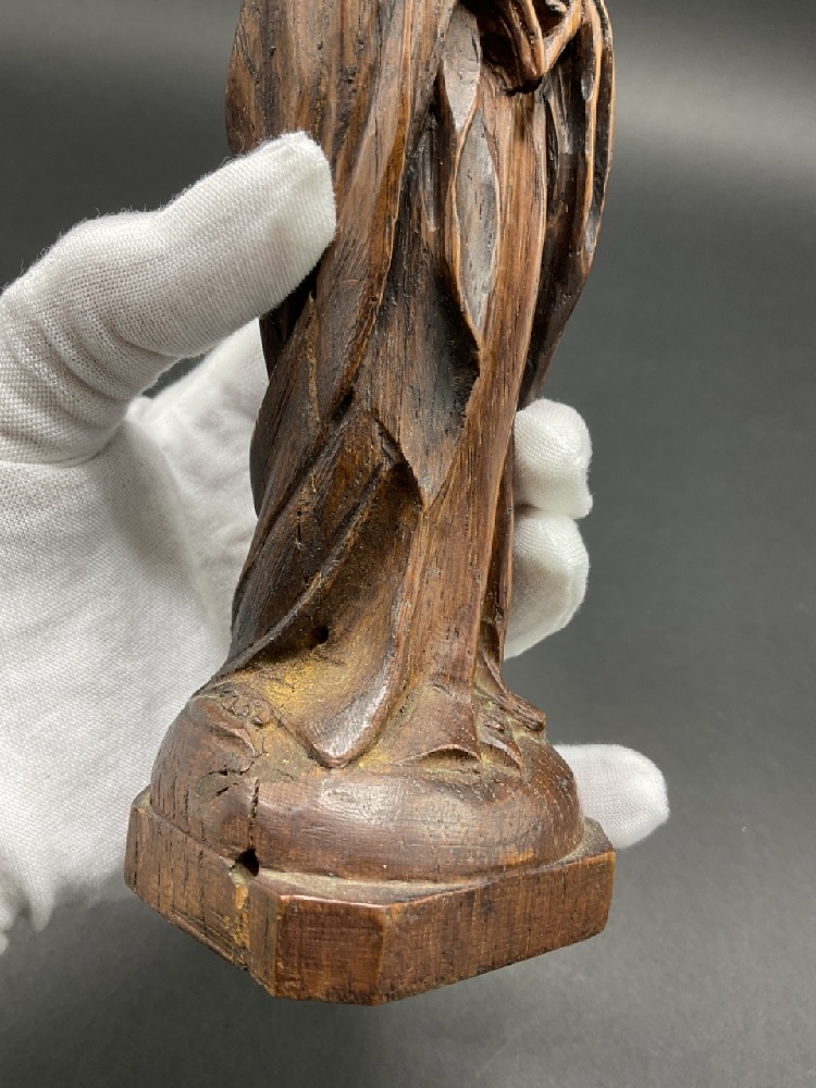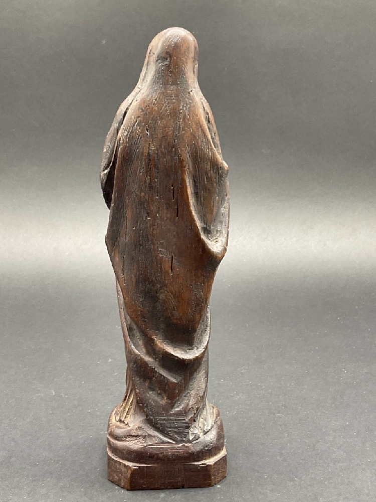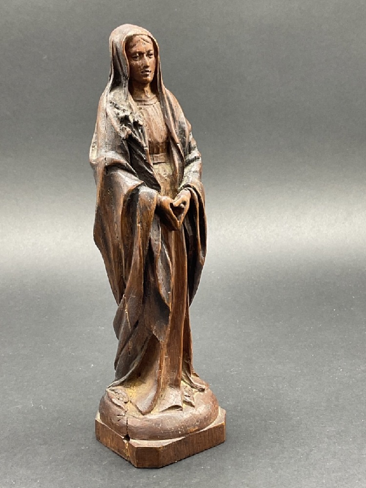 Carved Walnut Madonna Wood Statue. Late 19th century. Splitting at base noted.