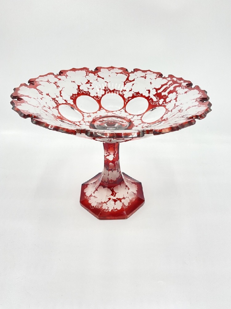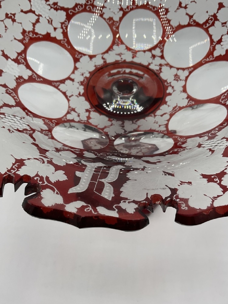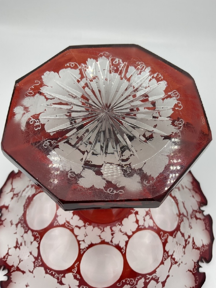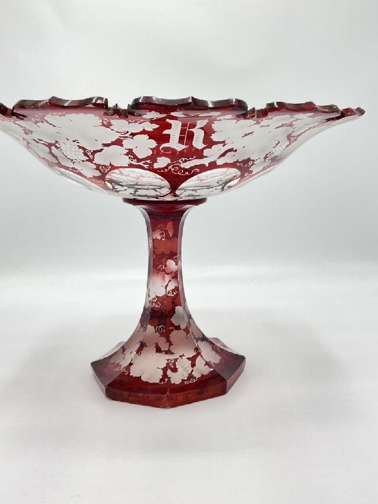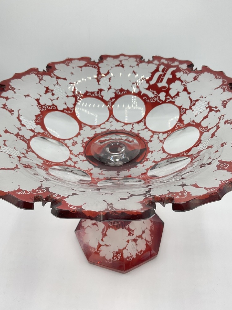 A Bohemian etched Ruby cut to clear glass compote. Dimensions: 9" X 12"