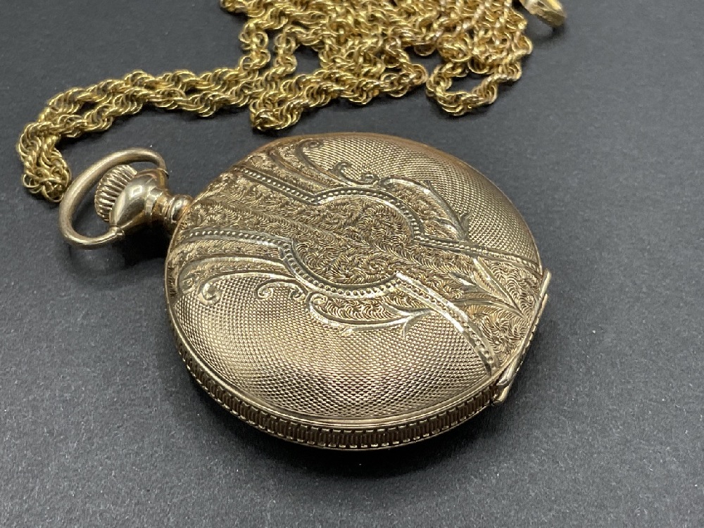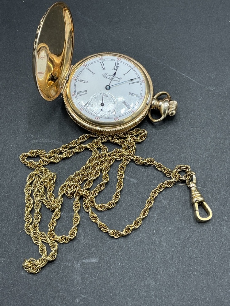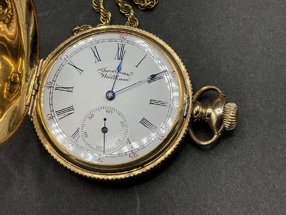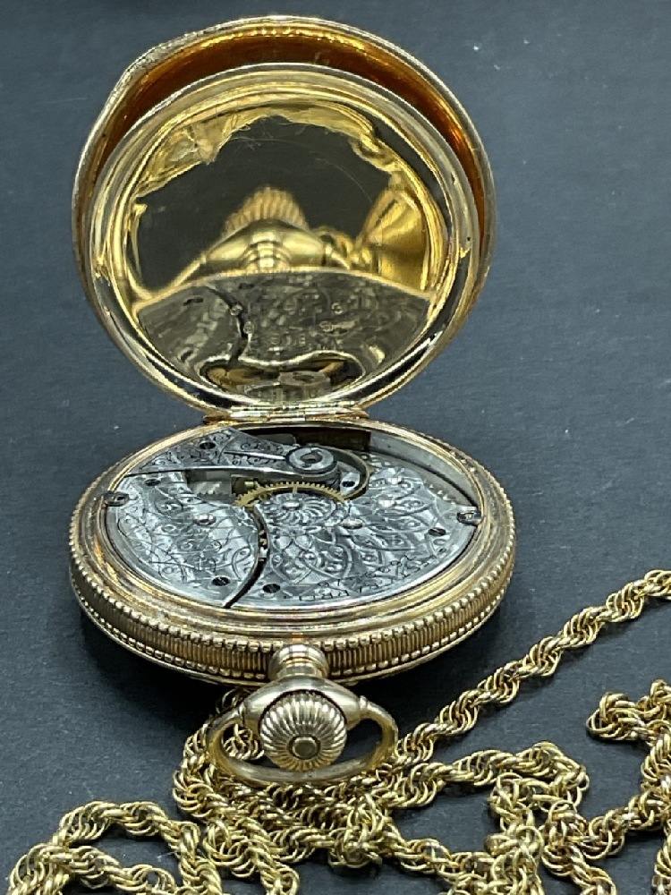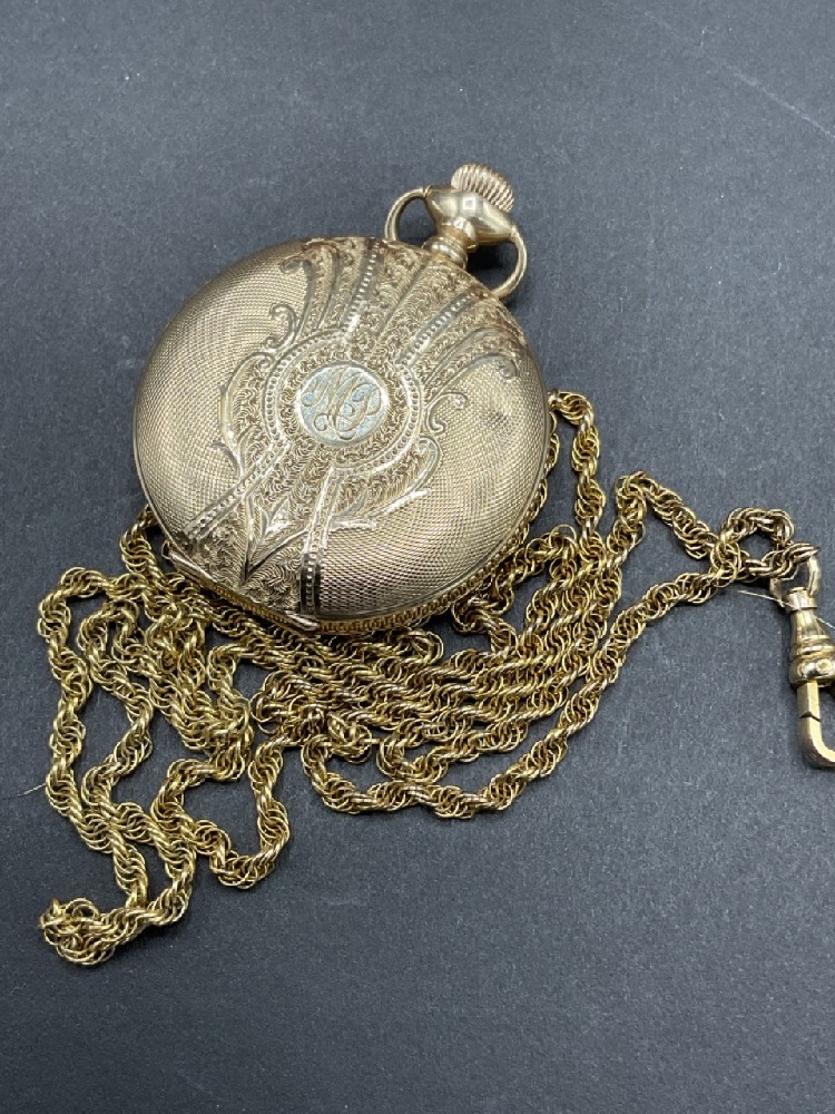 14K American Waltham pocket watch with second dial. Highly ornate case. Monogrammed. Running at time of inspection. Watch needs new crystal.