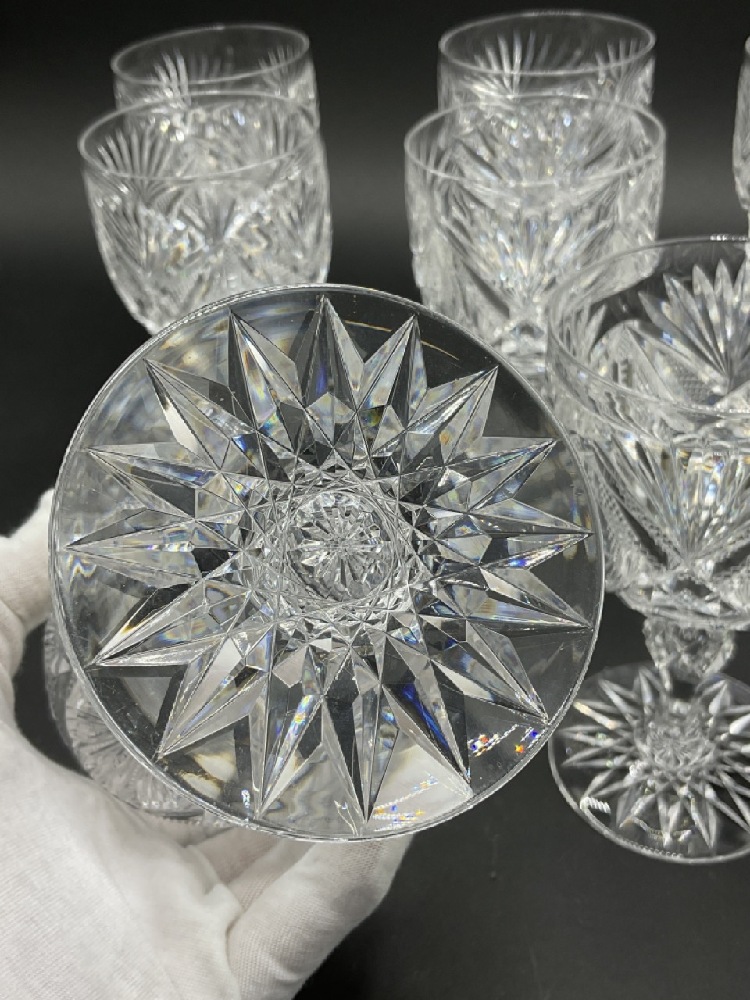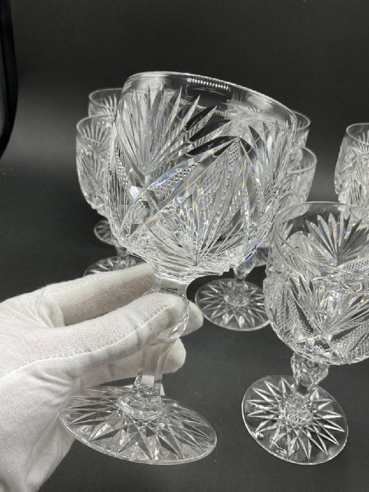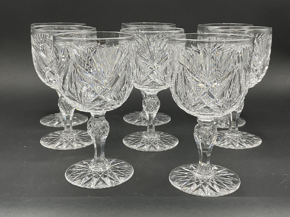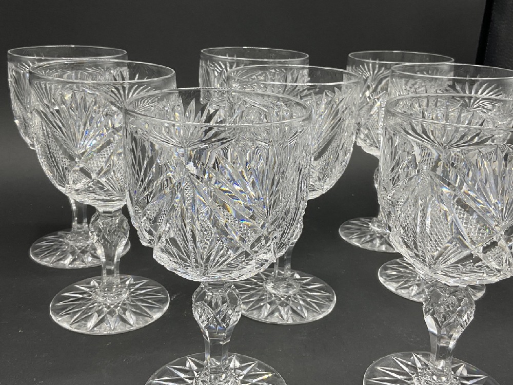 Eight (8) American Brilliant Cut Glass ABCG Diamond Point and Fan Goblets