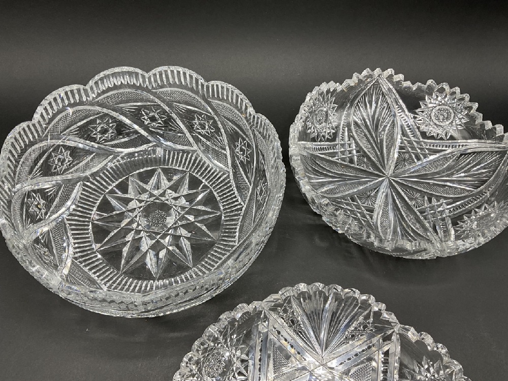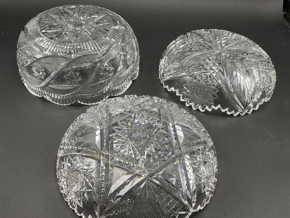 Three (3) Piece American Brilliant Cut Glass Bowls ABCG. Heavily cut in various patterns.