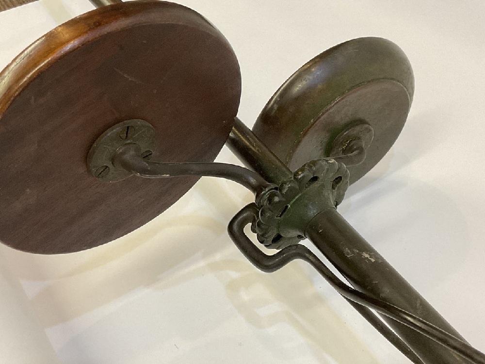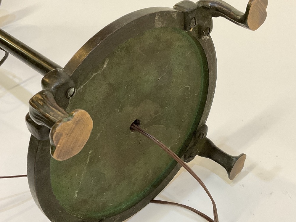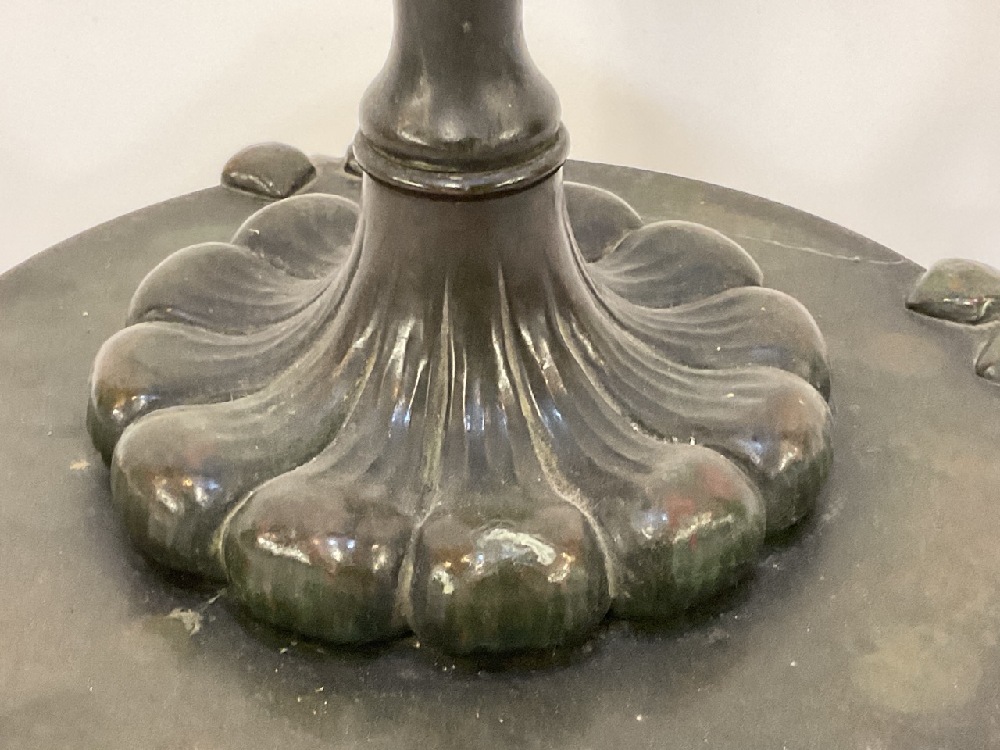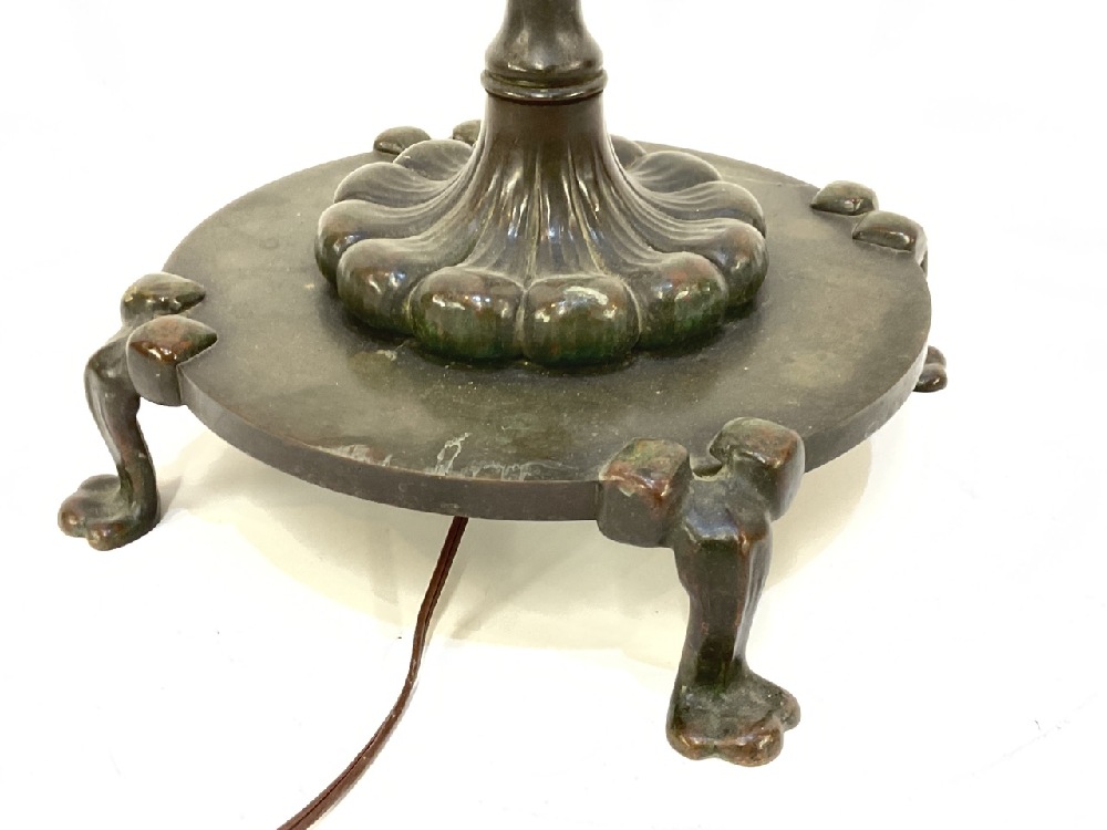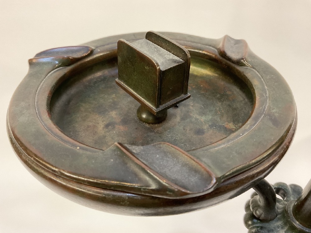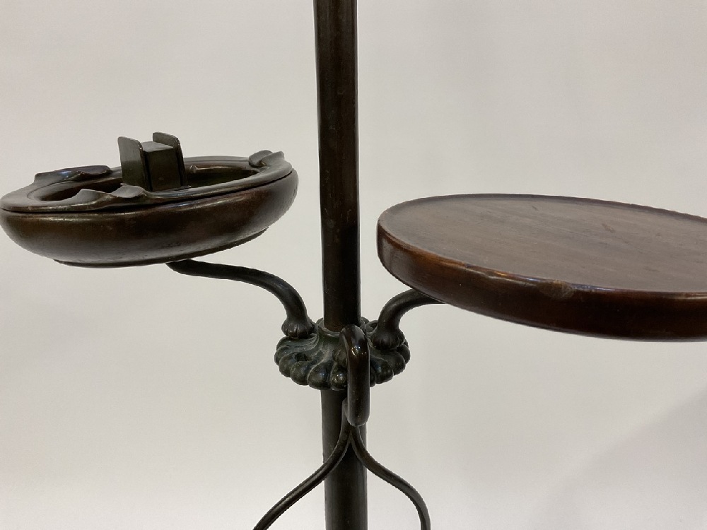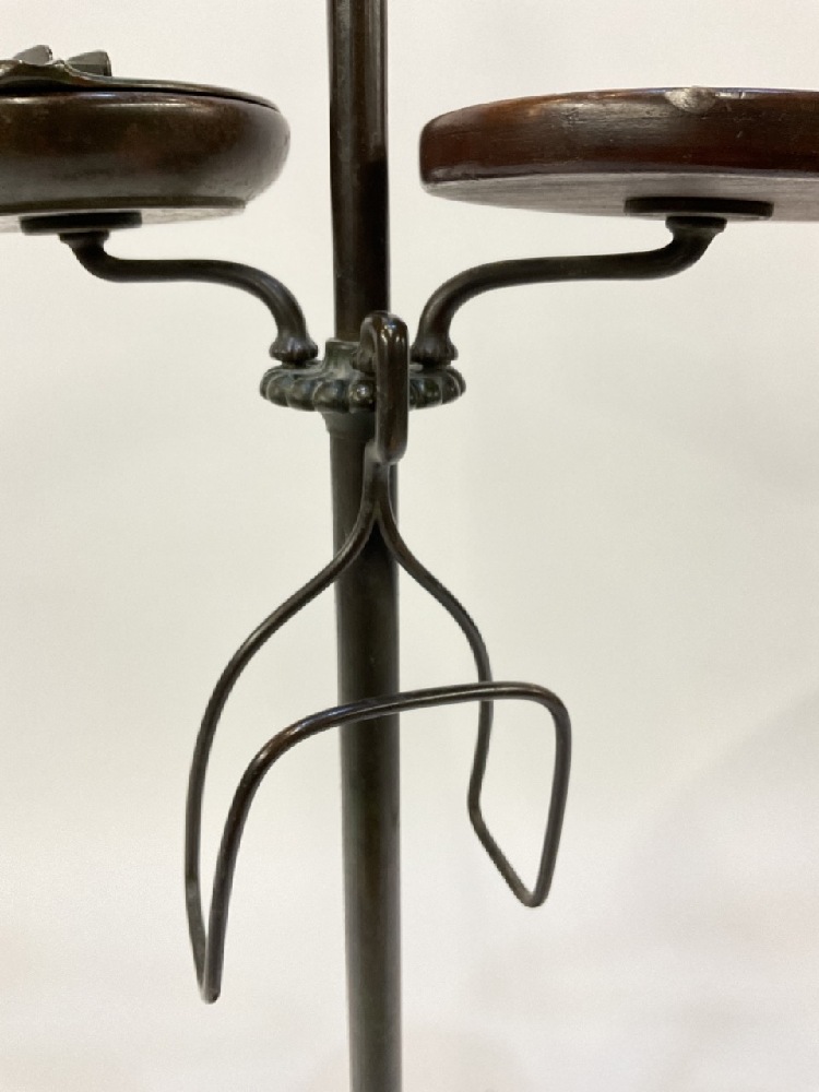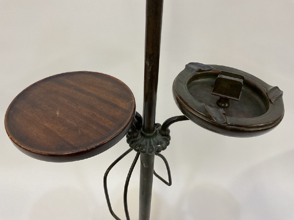 A Tiffany Studios #582 patinated bronze floor lamp with six (6) notches to hold accessories. Three accessories including small round wood table, newspaper holder and ashtray with match holder. Fine patina showing even throughout. Some surface scratching and normal use wear. No shade present.