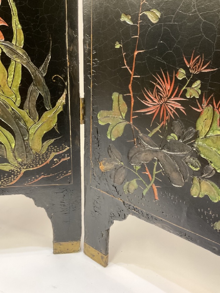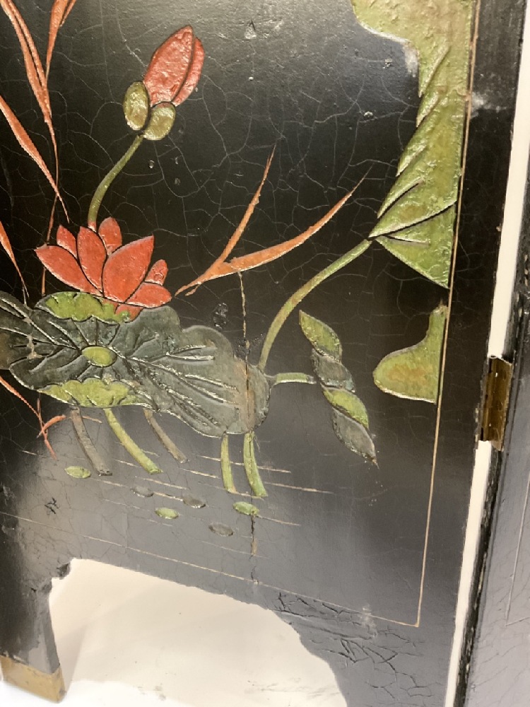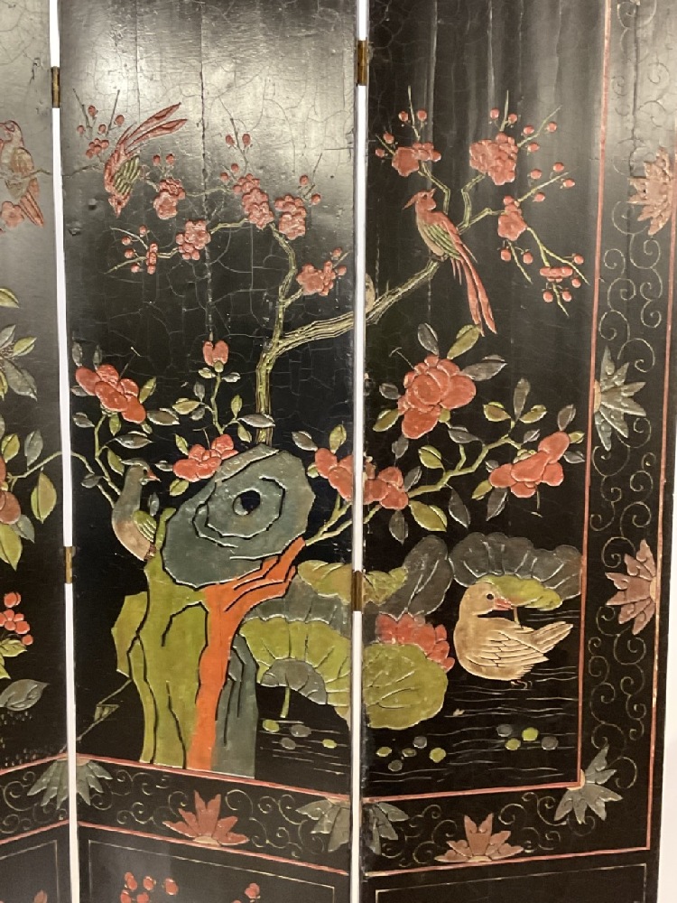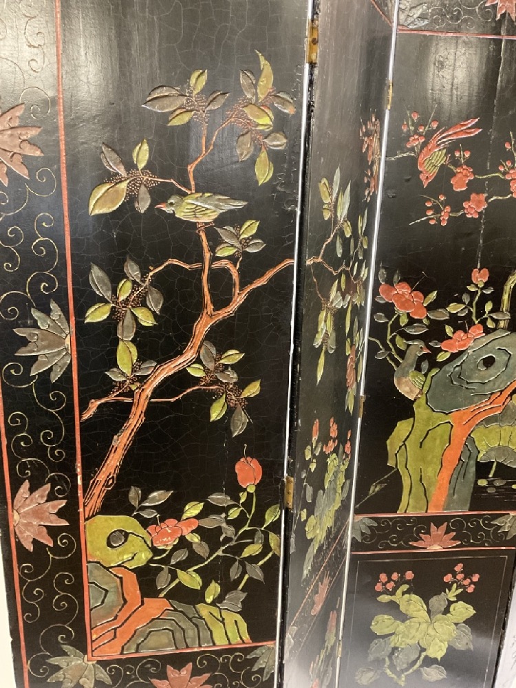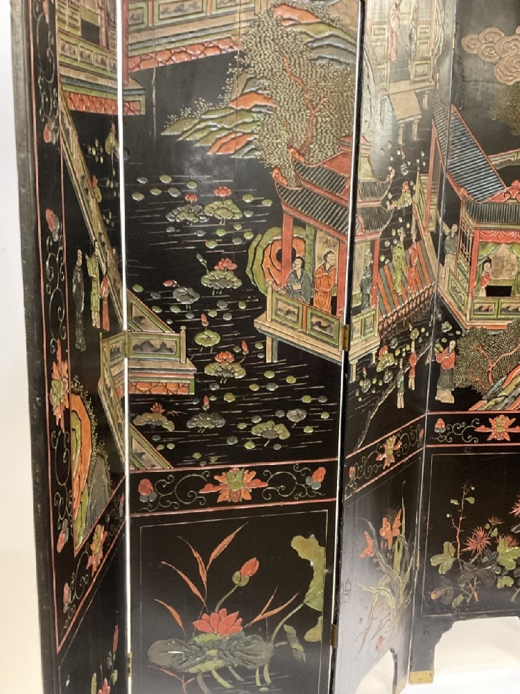 Chinese Coromandel Four Panel Room Screen. lacqured wood with hand painted accents. Late 19th century. One side having foliage and garden scene with birds and other side depicts traditional Chinese court yard scene with figures.