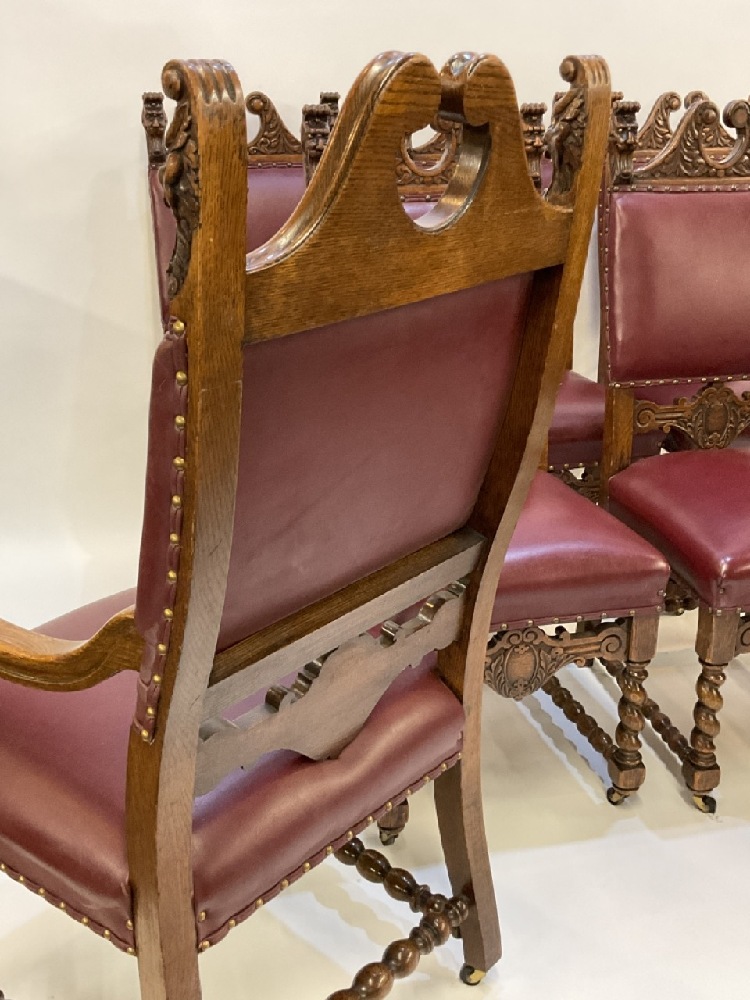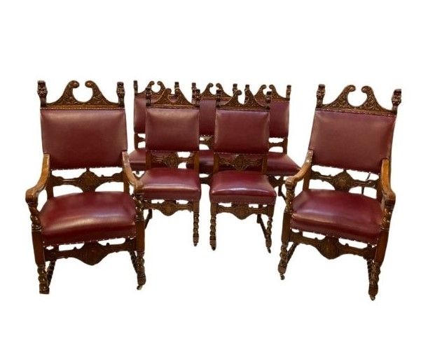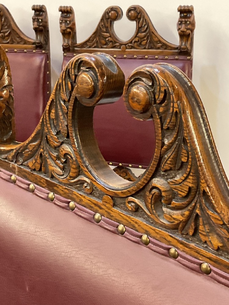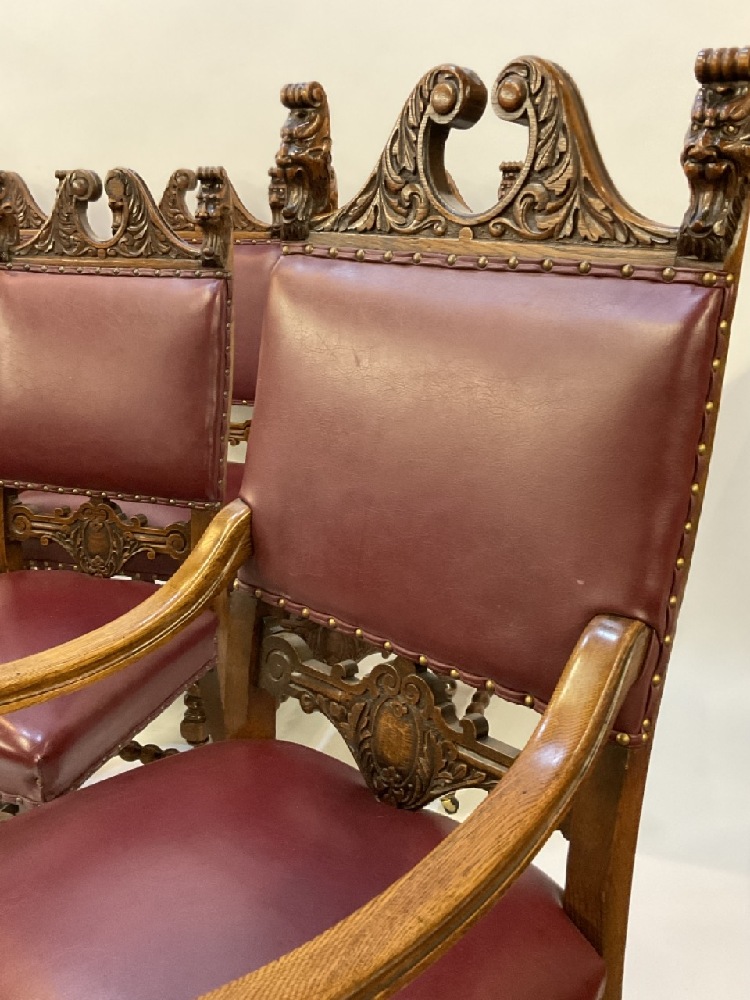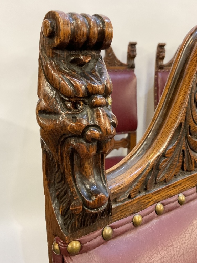 19th century Renaissance Revival set of seven (7) carved oak dining chairs. Five (5) side chairs and Two (2) arm chairs. Red naugahyde upholstery with brass tack trim. Heavily carved crest with lions head scrolls and raised on shaped legs with