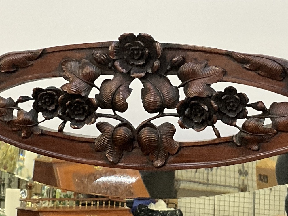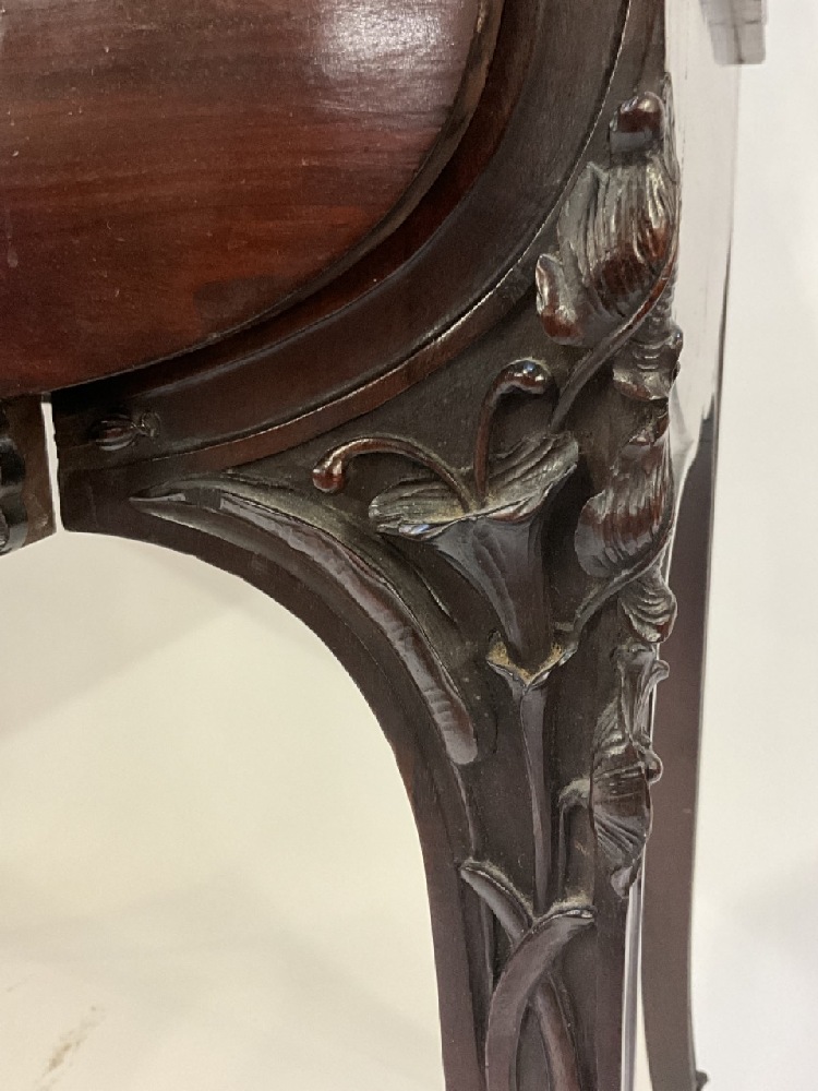 Birds eye maple secondary wood. Some damage to applied wood carvings of florals noted. Please see photograph preview. Marquetry work very fine and even finish.