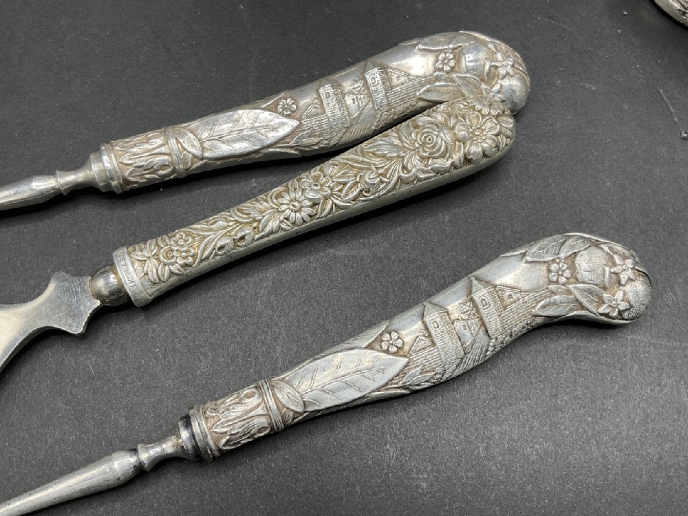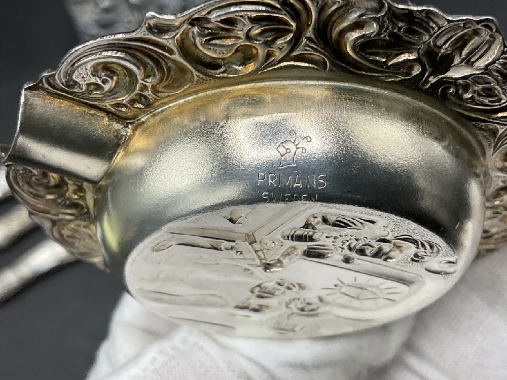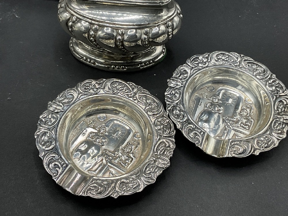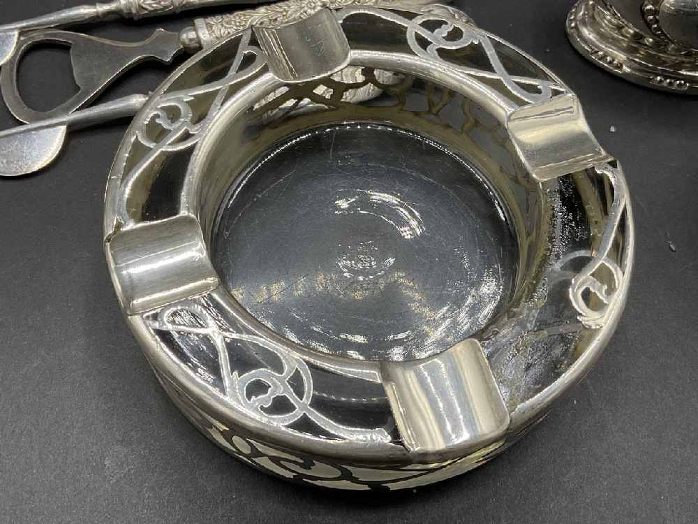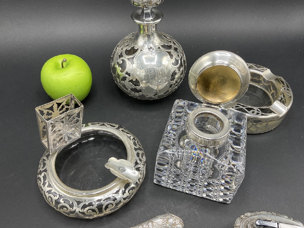 An estate compiled grouping of sterling silver overlay ashtrays, inkwell, barware accessories, two Sweden plated single ashtrays and decanter.
