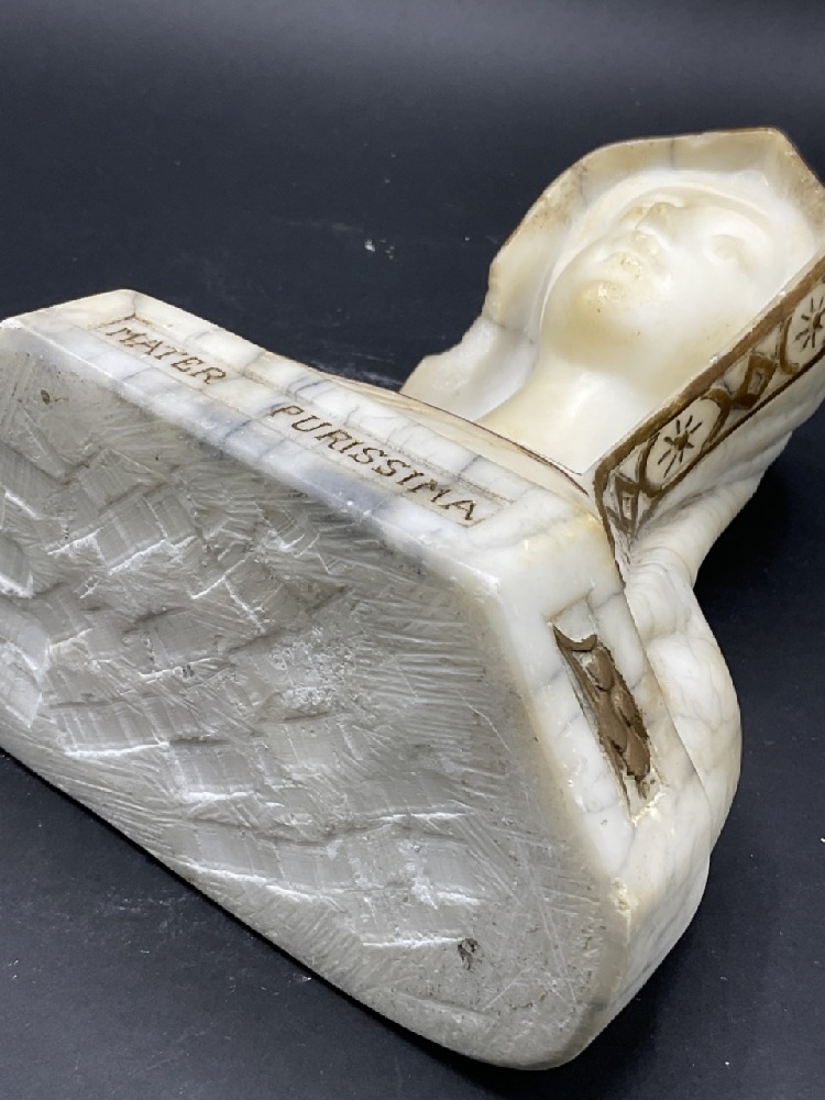 A soap stone statue of Madonna "Mater Purssima" Damage to veil noted. Please see photograph preview.