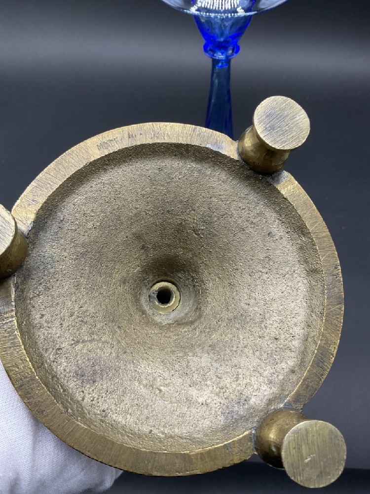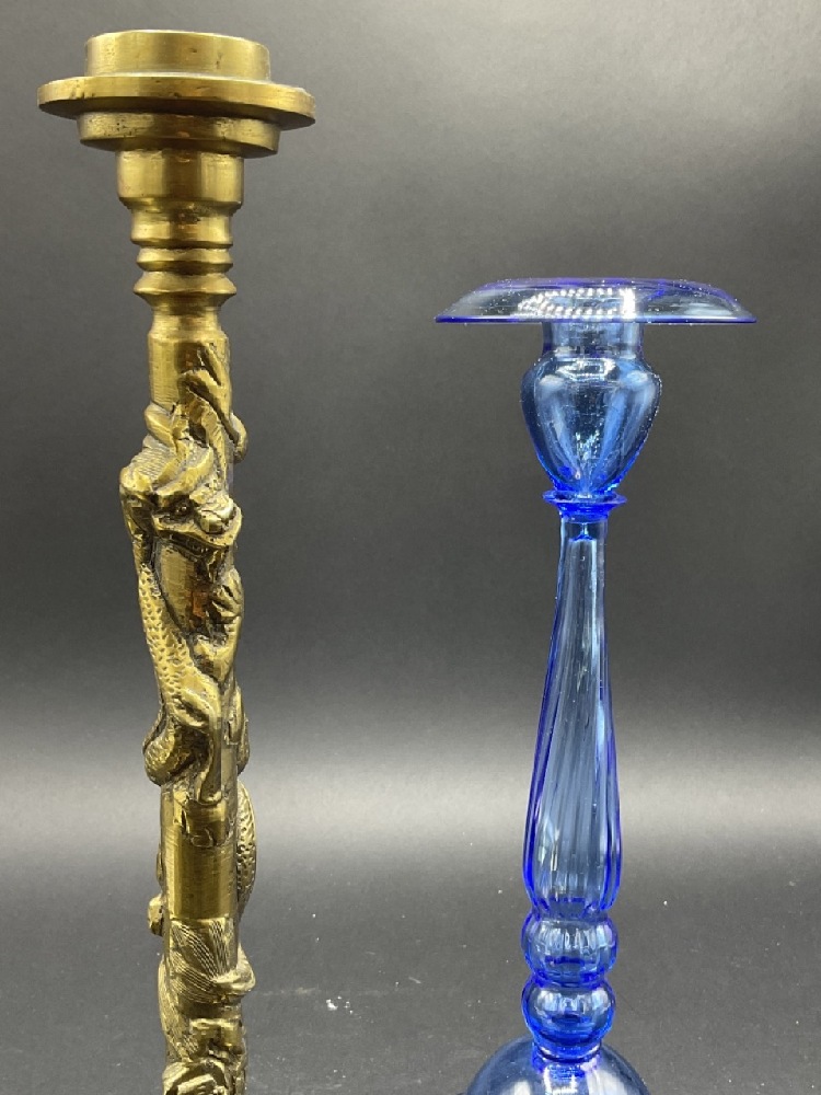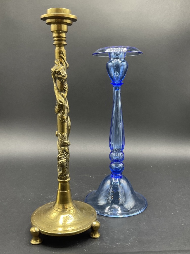 Two (2) Estate compiled candlestick singles. Bronze "Made in China" decorated with dragons and single hand blown blue glass candlestick.