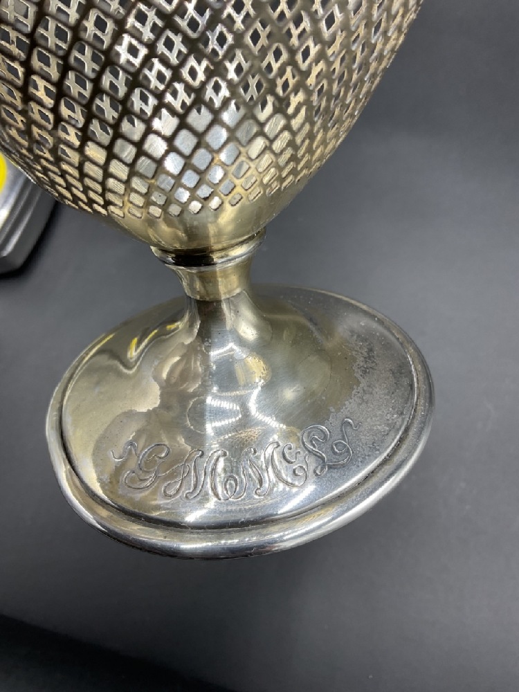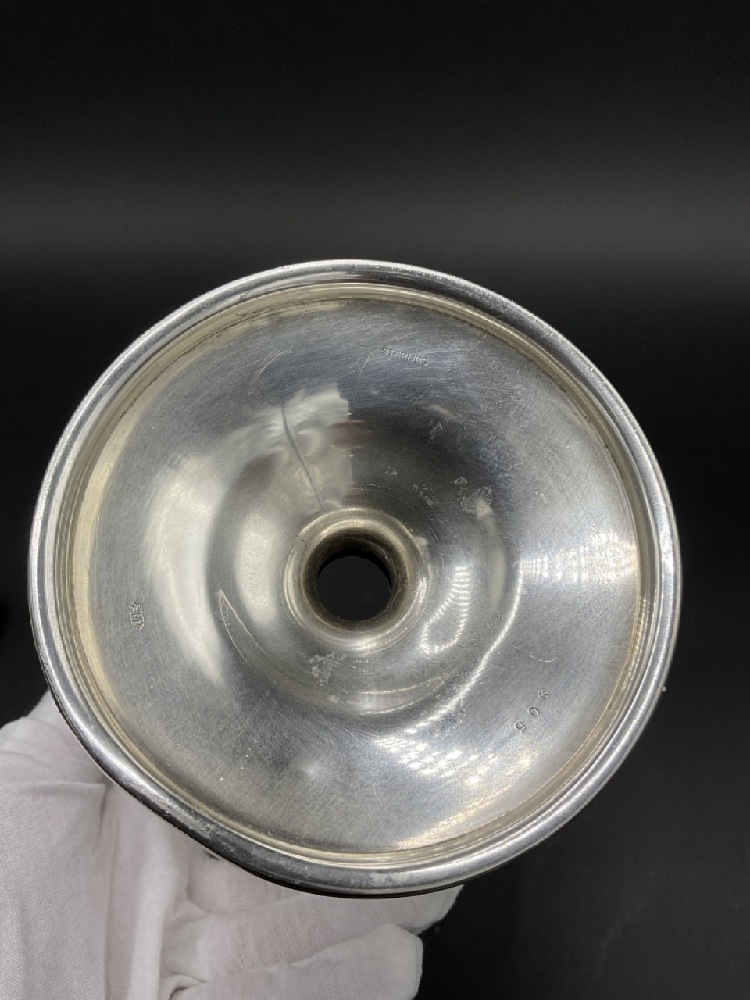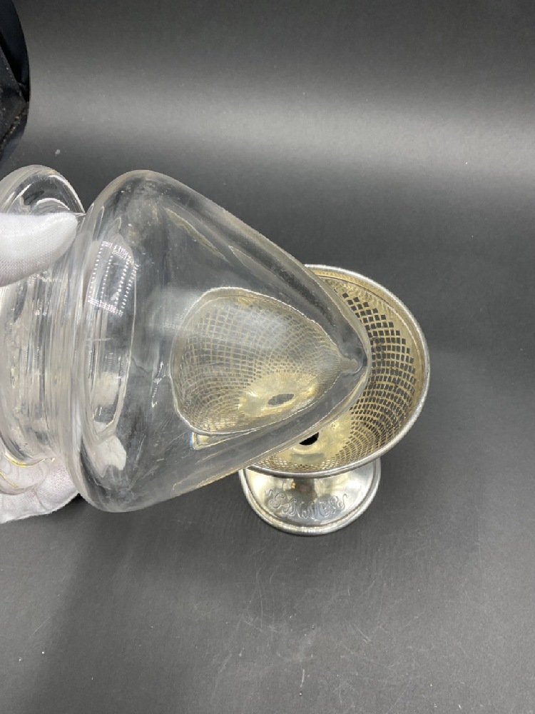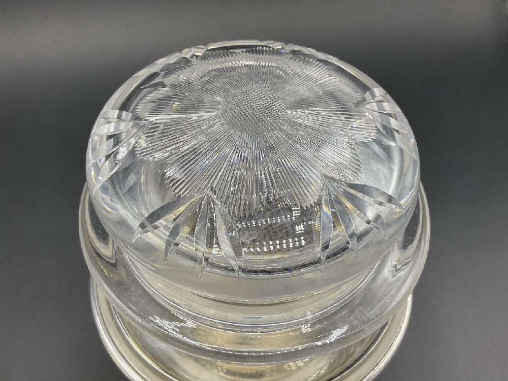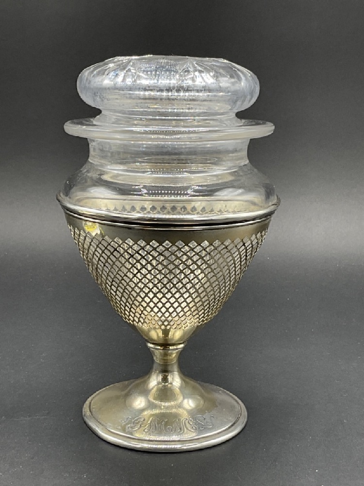 An American Brilliant Cut Glass period dresser jar with sterling silver base. Jar is in a cone form to fit. Glass shows some sickness after cleaning. Additional cleaning needed.