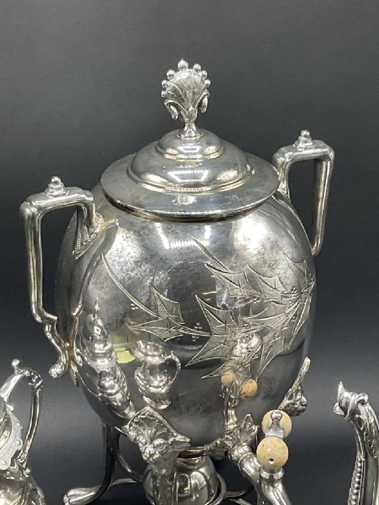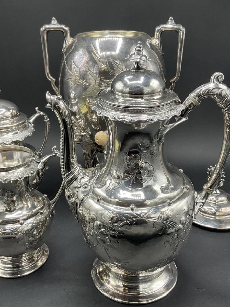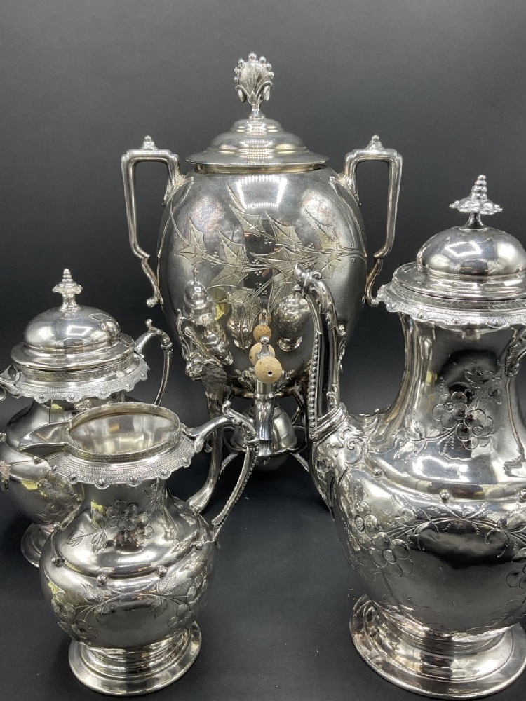 A late Victorian era silver plated teaset. Teapot, sugar and creamer matching and hot water kettle is a marriage to set.