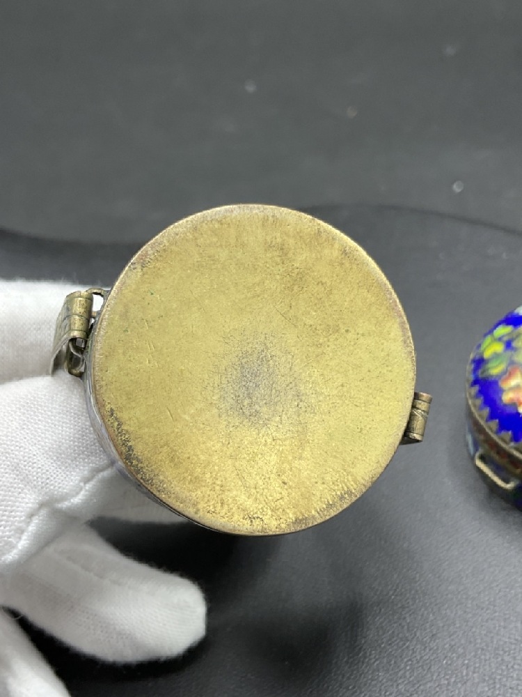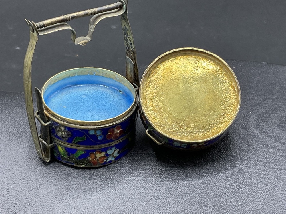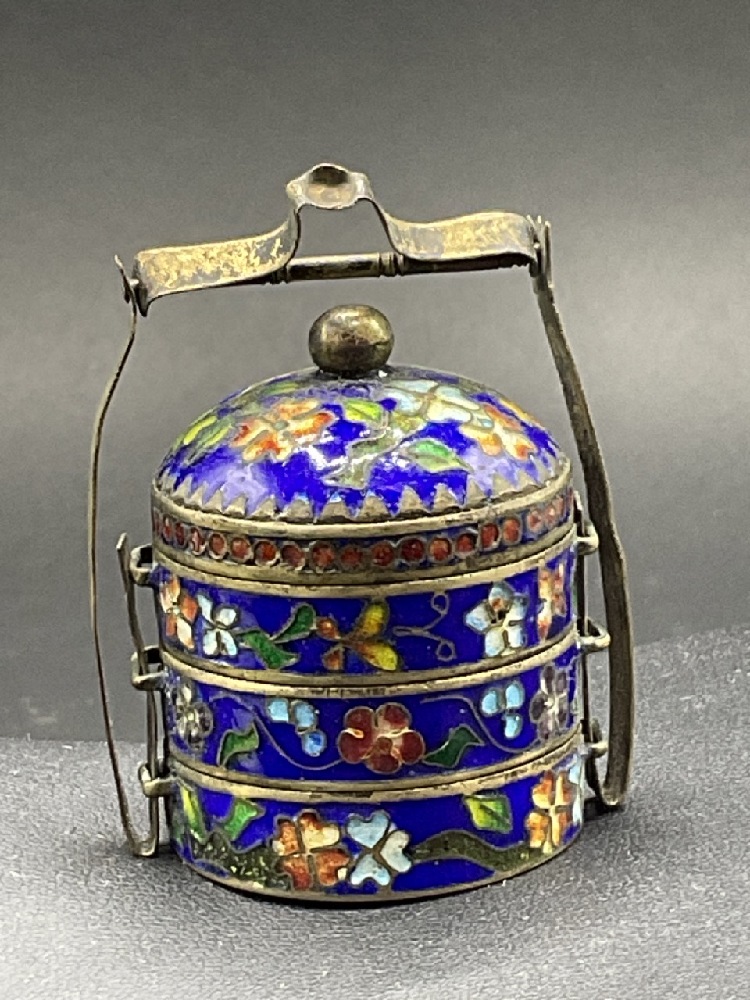 Chinese Cloisonne enameled sterling silver stacking spice box.