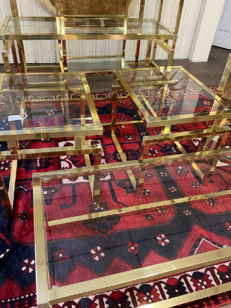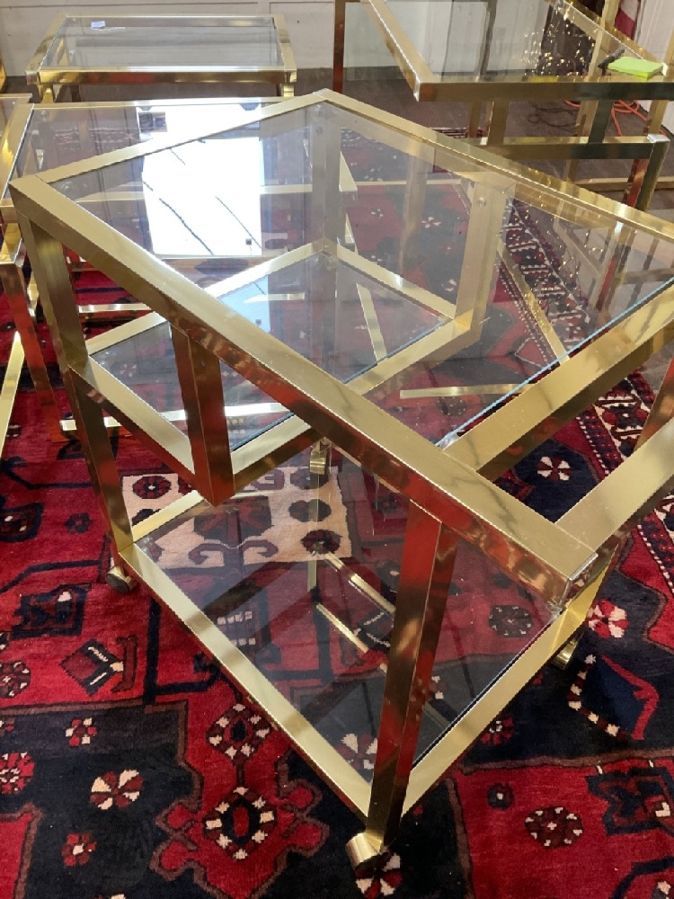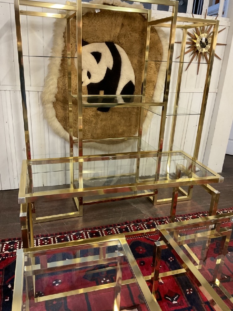 Eight (8) Piece, very light weight metal with brass color and chrome finish. Clean set including wall unit, tea cart, hallway table and mirror, two console tables and two end tables.