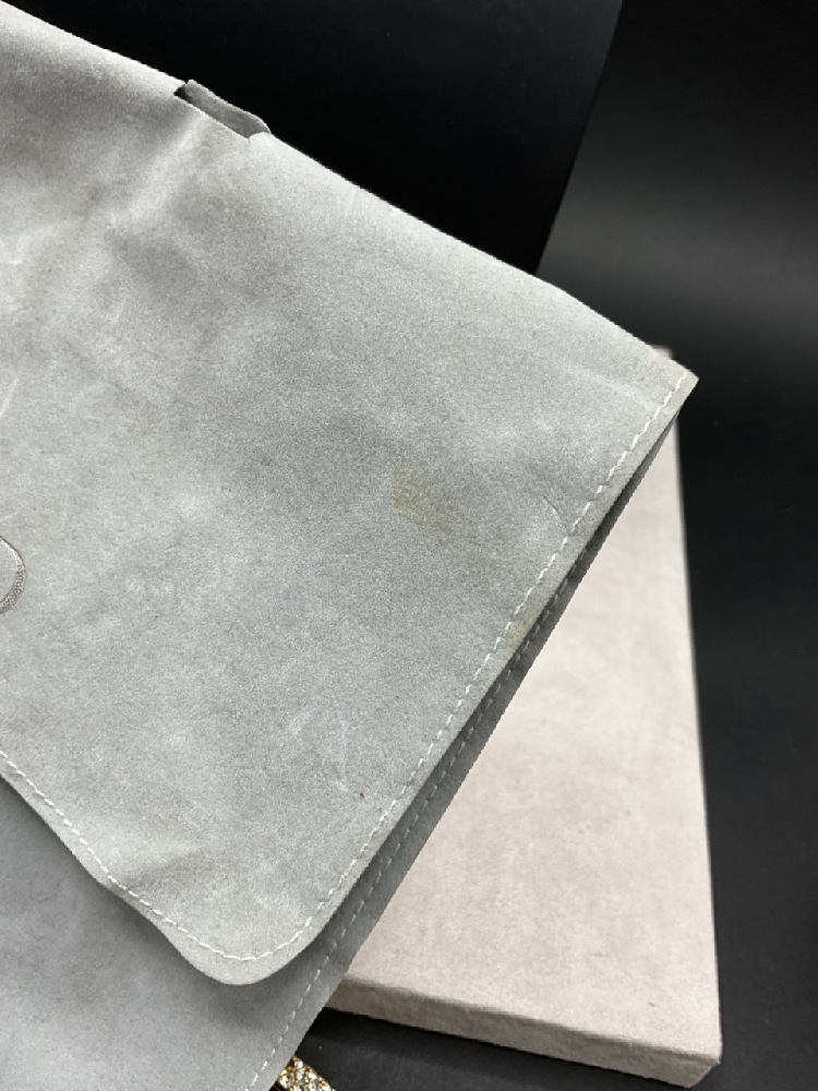 Dust bag has small stain. Necklace near mint.