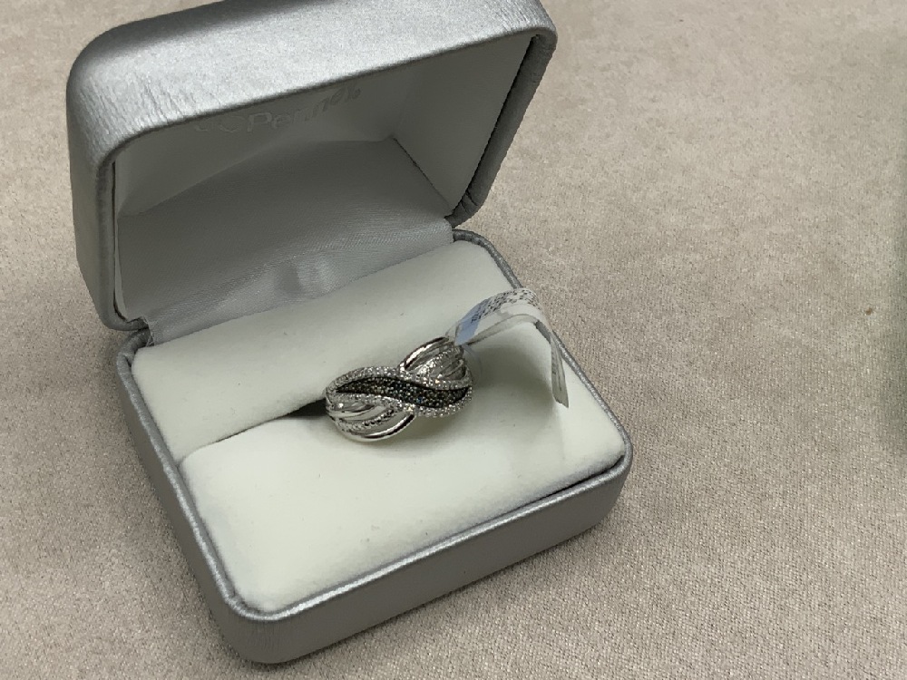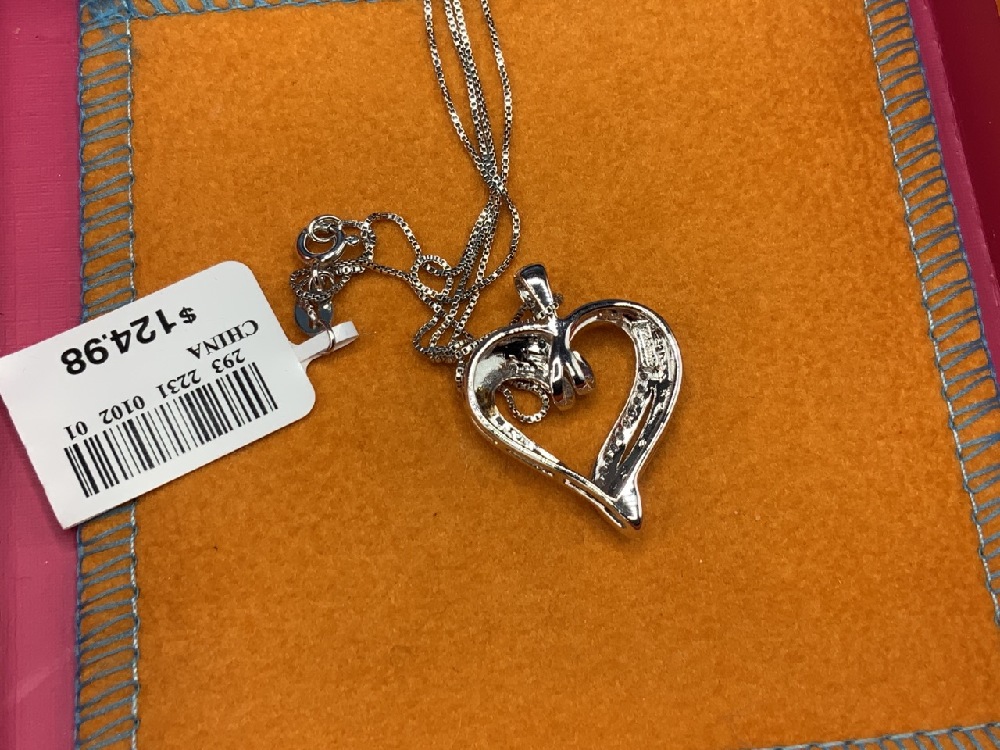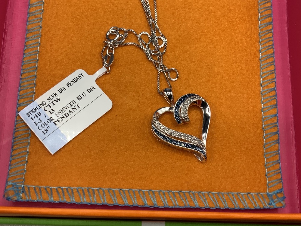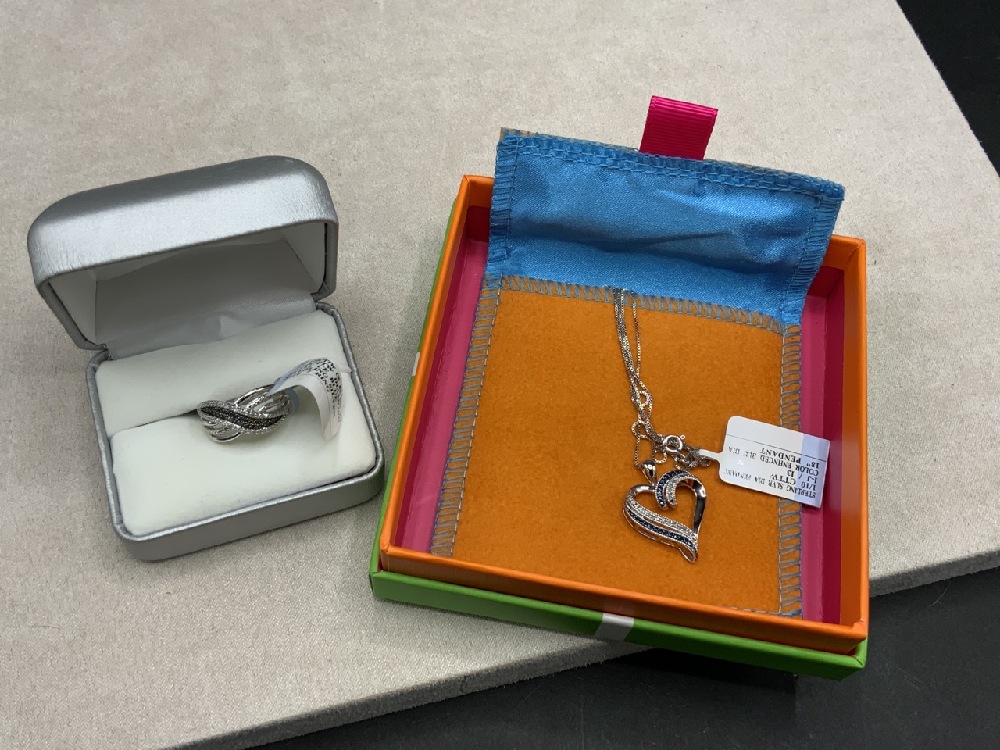 Sterling silver blue diamond ring and heart pendant necklace. Boxed.