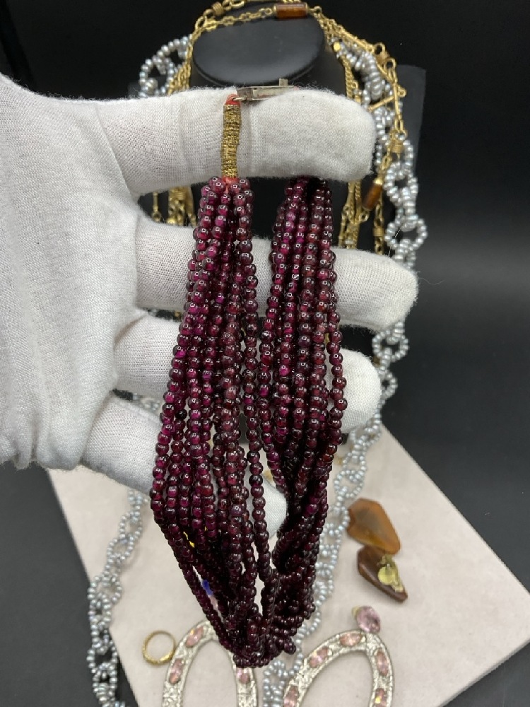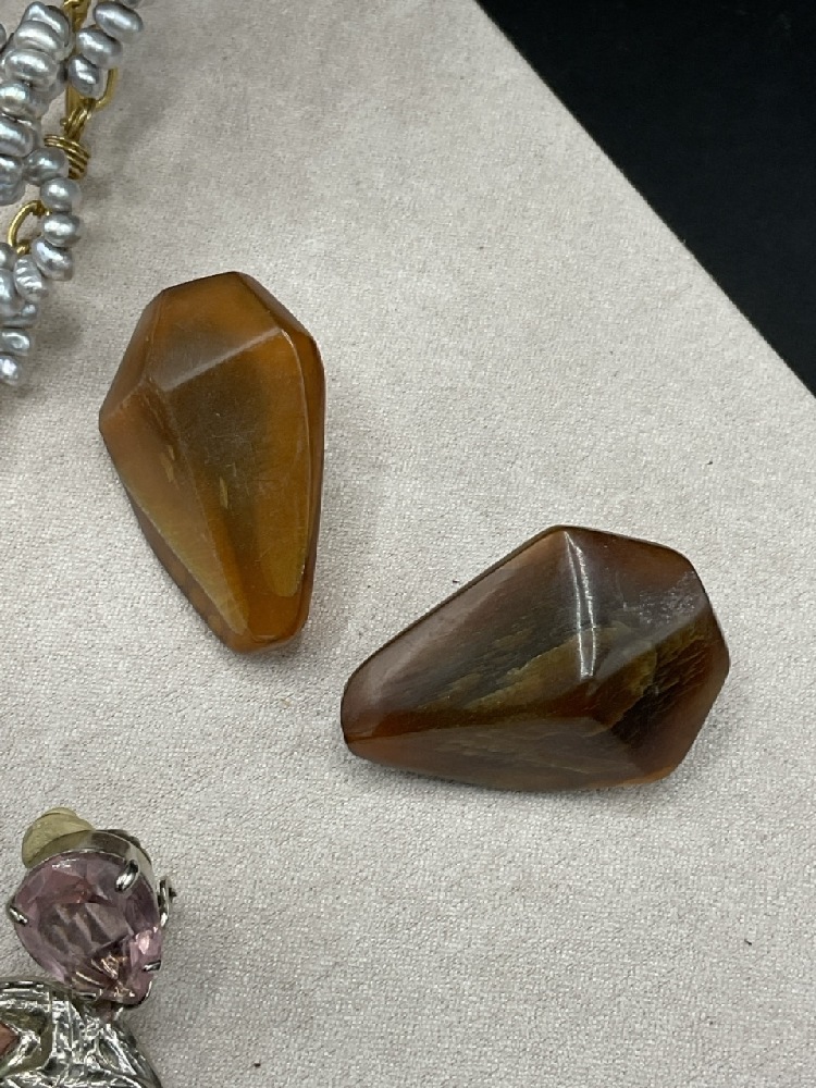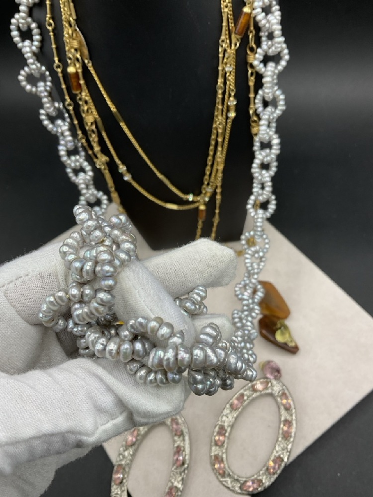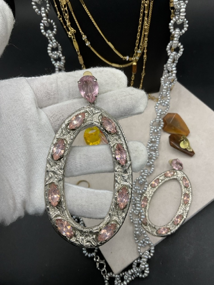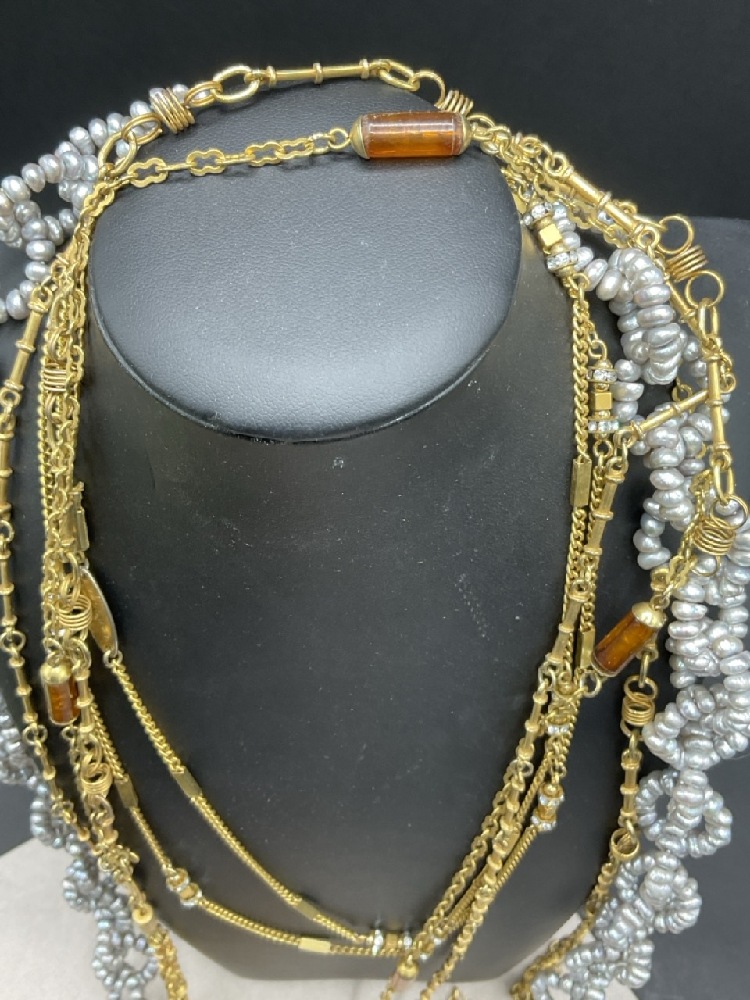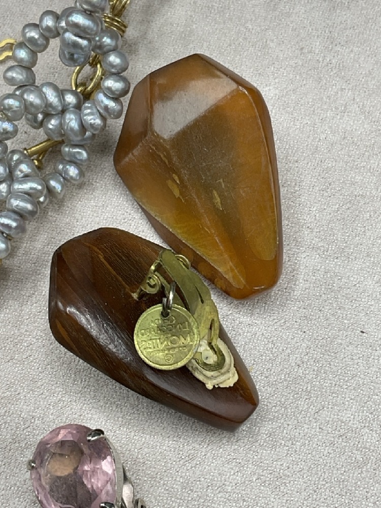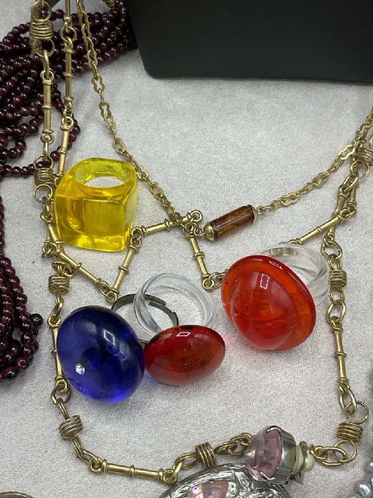 Estate Compiled Vintage Costume Jewelry Group. Including Gerda Lynggaard Monies horn earrins, Lanvin ring, Two (2) Guy Laroche necklaces, glass and lucite rings etc.